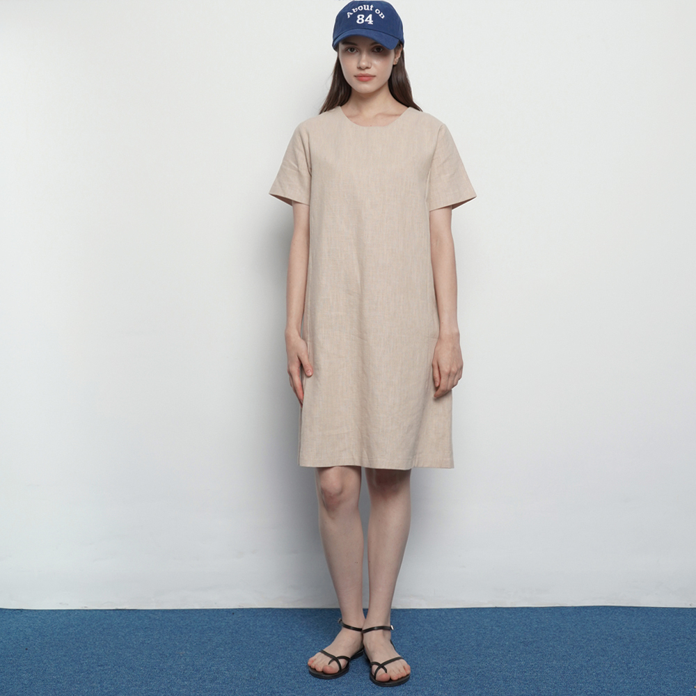 린넨소재의 여름 바캉스룩으로 백오픈 디자인의 홀터넥드레스