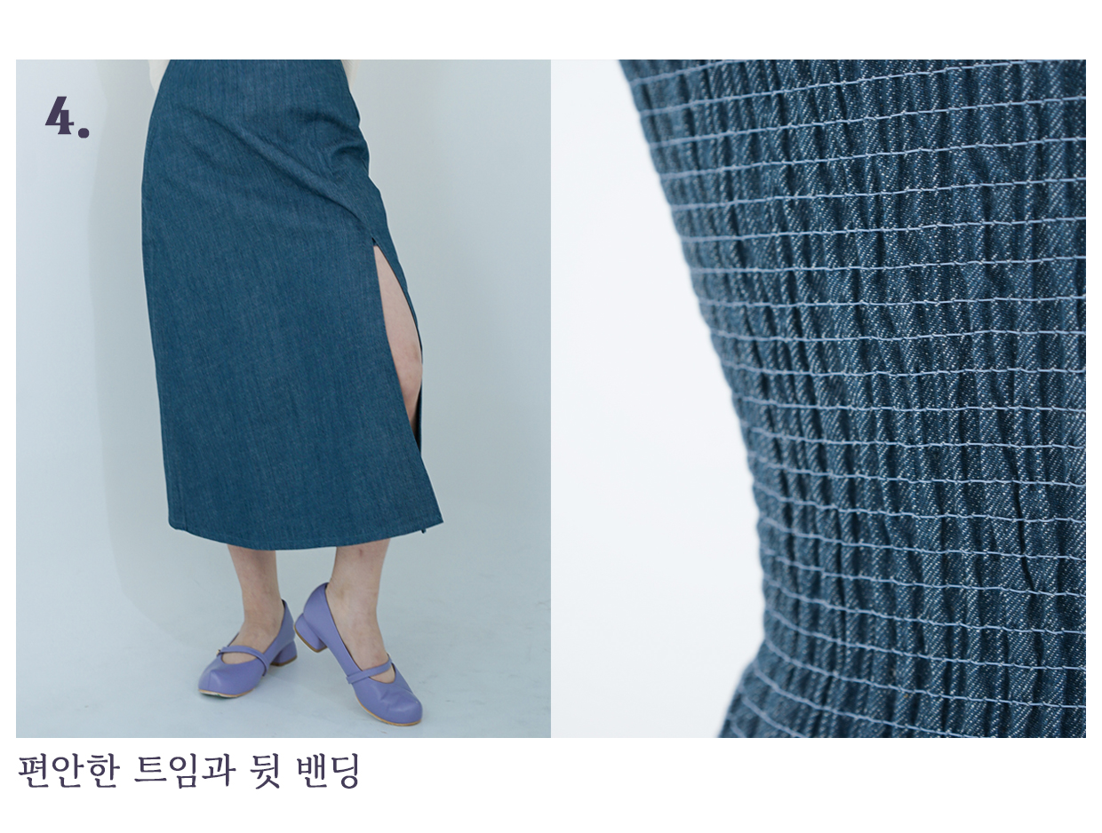 스트레치가 있는 코튼/레이온 소재의 스커트로 앞 뒤 라인에 절개 디자인을하여 날씬해보입니다.