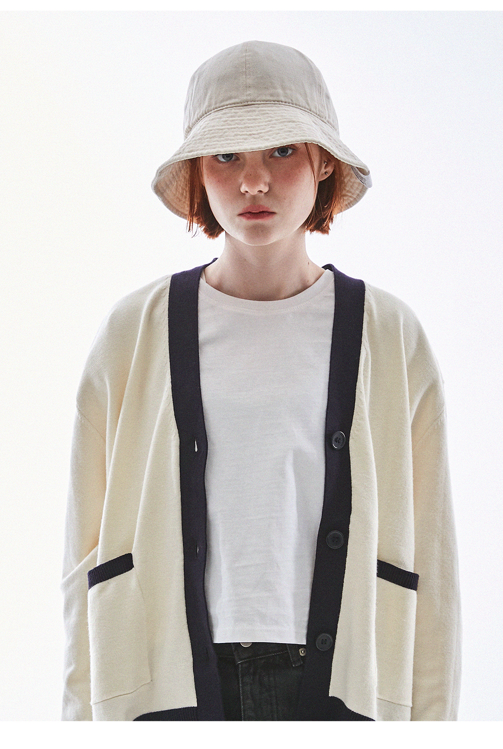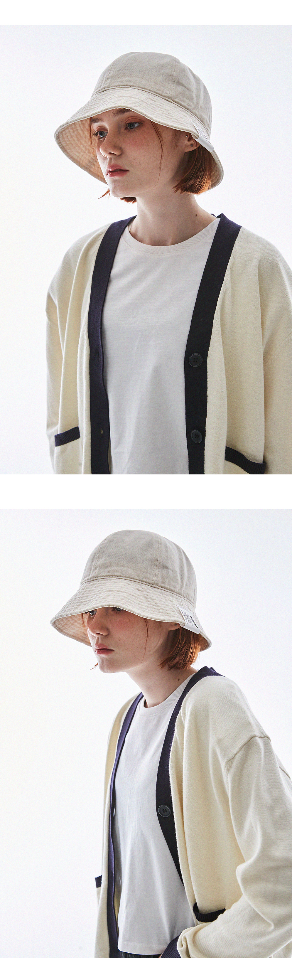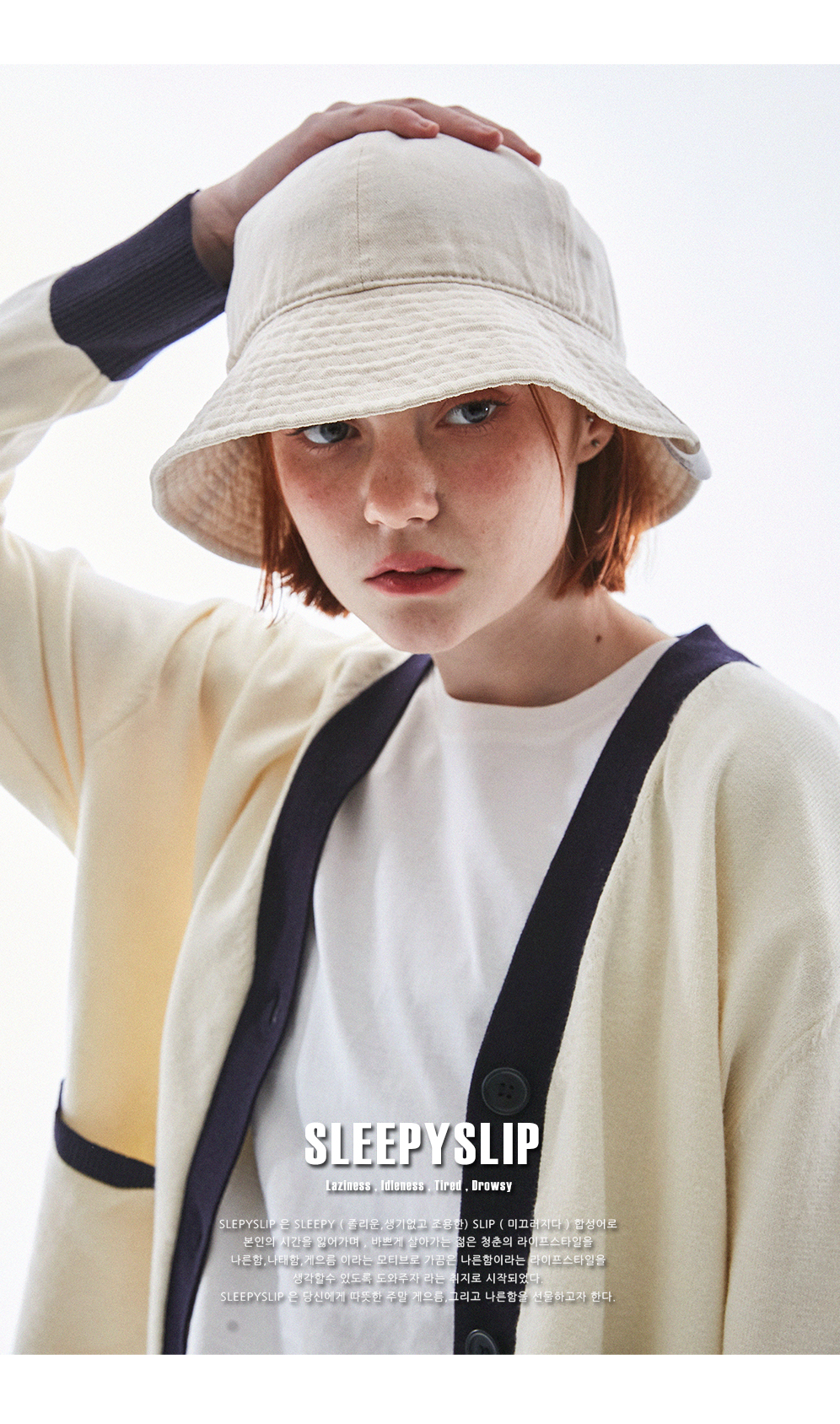 스트링 디테일로 안정감 있게 착용되는 니트 비치 버킷햇
