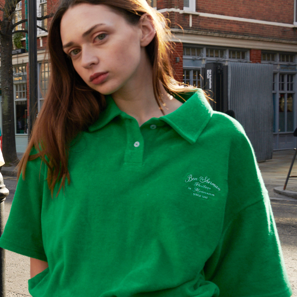 캐주얼한 스트라이프와 럭비 카라 디테일로 스포티한 무드를 살린 반팔 티셔츠