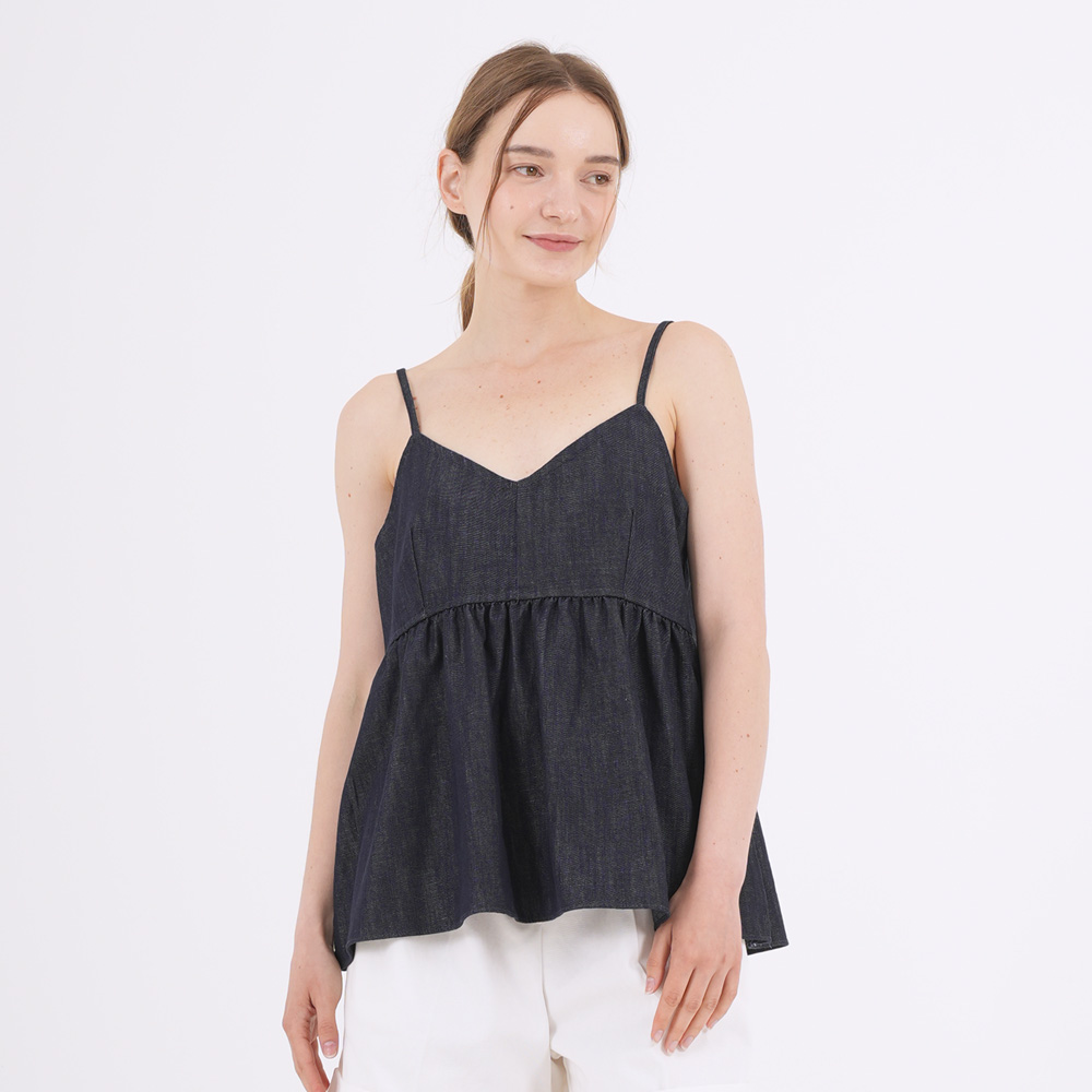 은은하게 반짝이는 소재 위로 언밸런스한 핀턱과 밑단 스트랩 디테일로 입체적인 포인트를 더한 나시입니다.