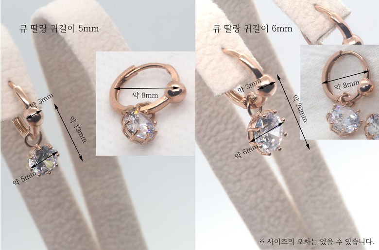 귀걸이 5mm : 볼 가로 약 3mm, 볼 기준 세로 약 19mm, 큐빅지름 약 5mm, 원 안지름 약 8mm