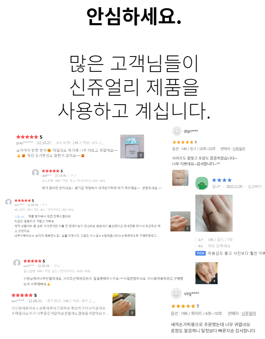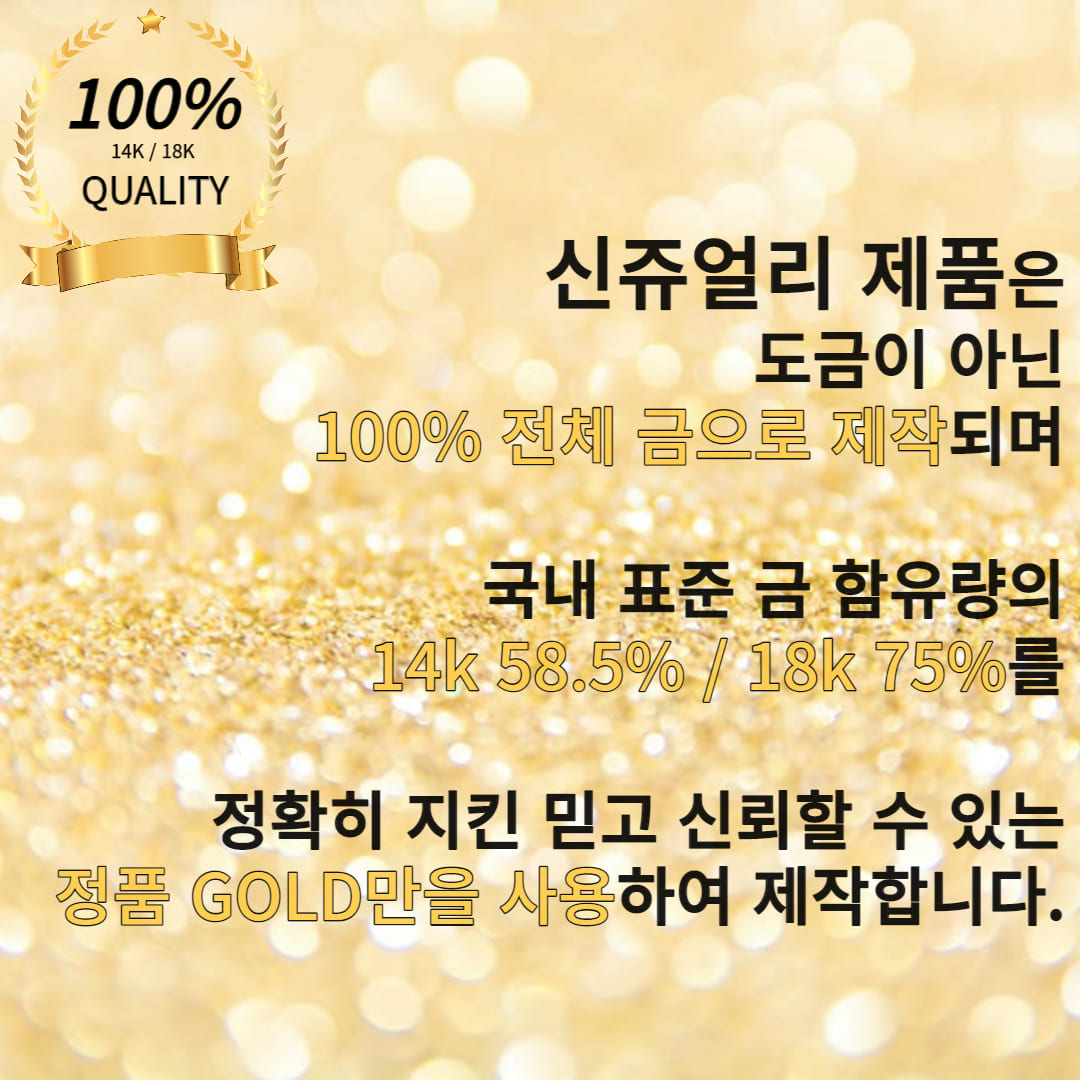 신쥬얼리의 모든 제품은 도금이 아닌 법정 금 함유량에 따른 14k, 18k 제품입니다.