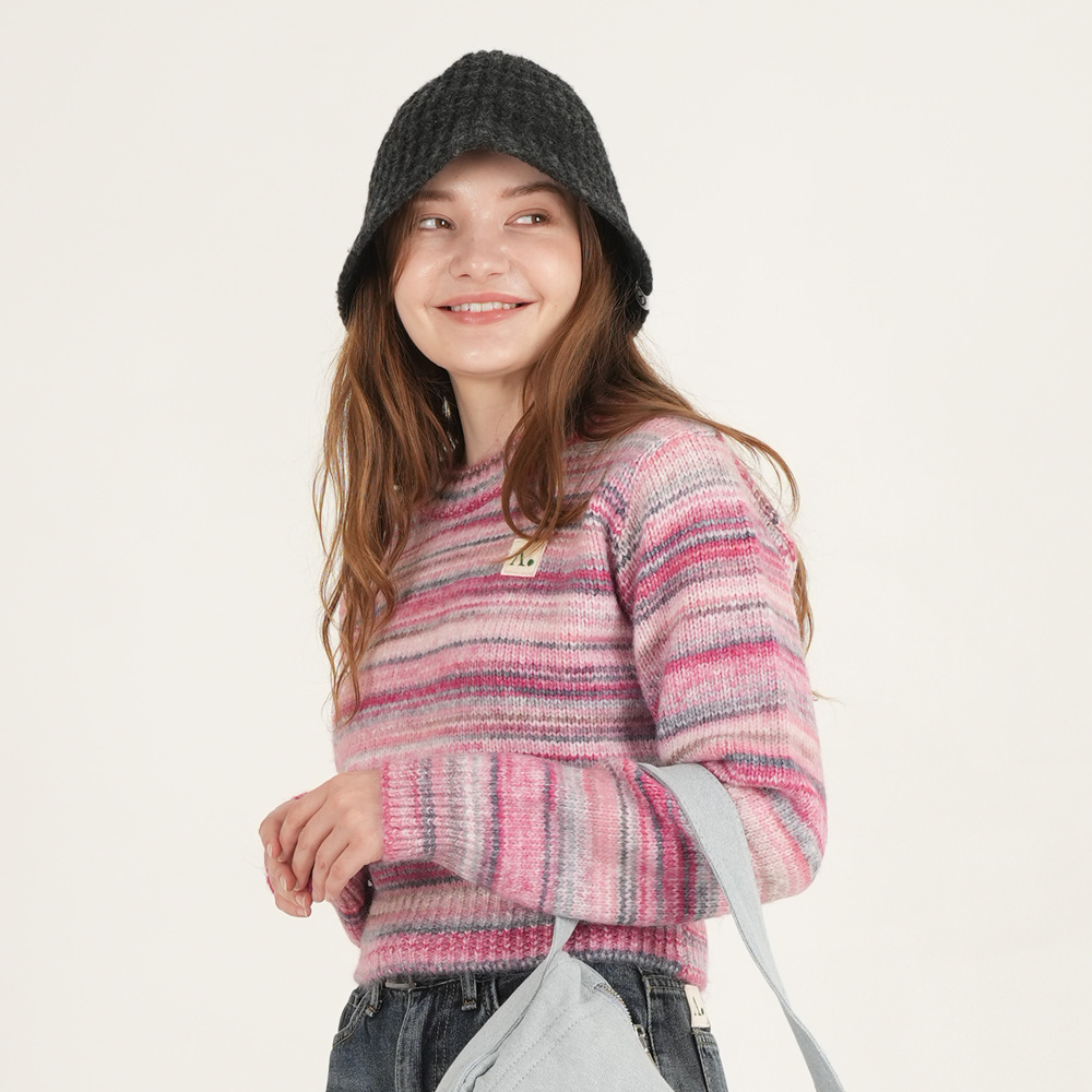 캐주얼한 무드의 스트라이프 패턴과 후드 디테일이 돋보이는 반팔 니트