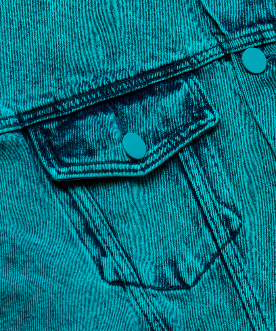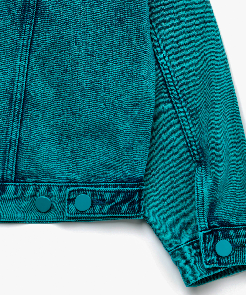 어깨의 레드컬러 아일렛이 돋보이는 케이아스의 폴드윙 데님자켓입니다