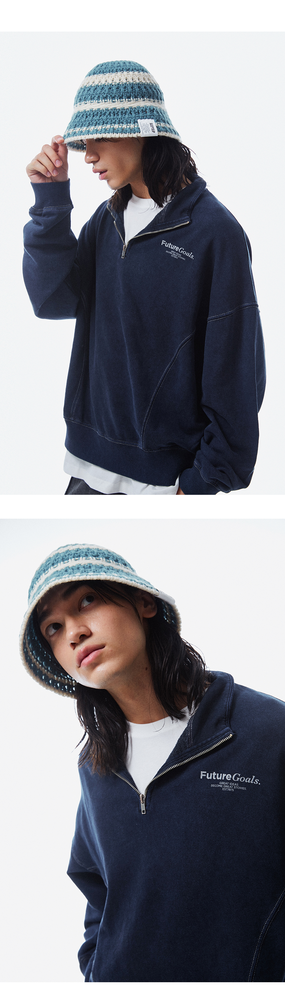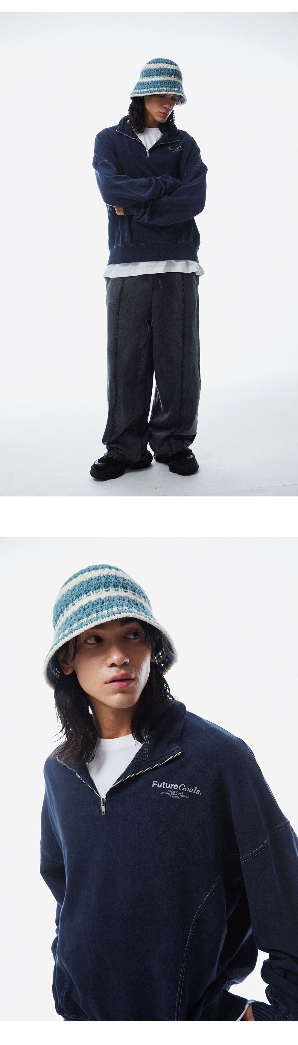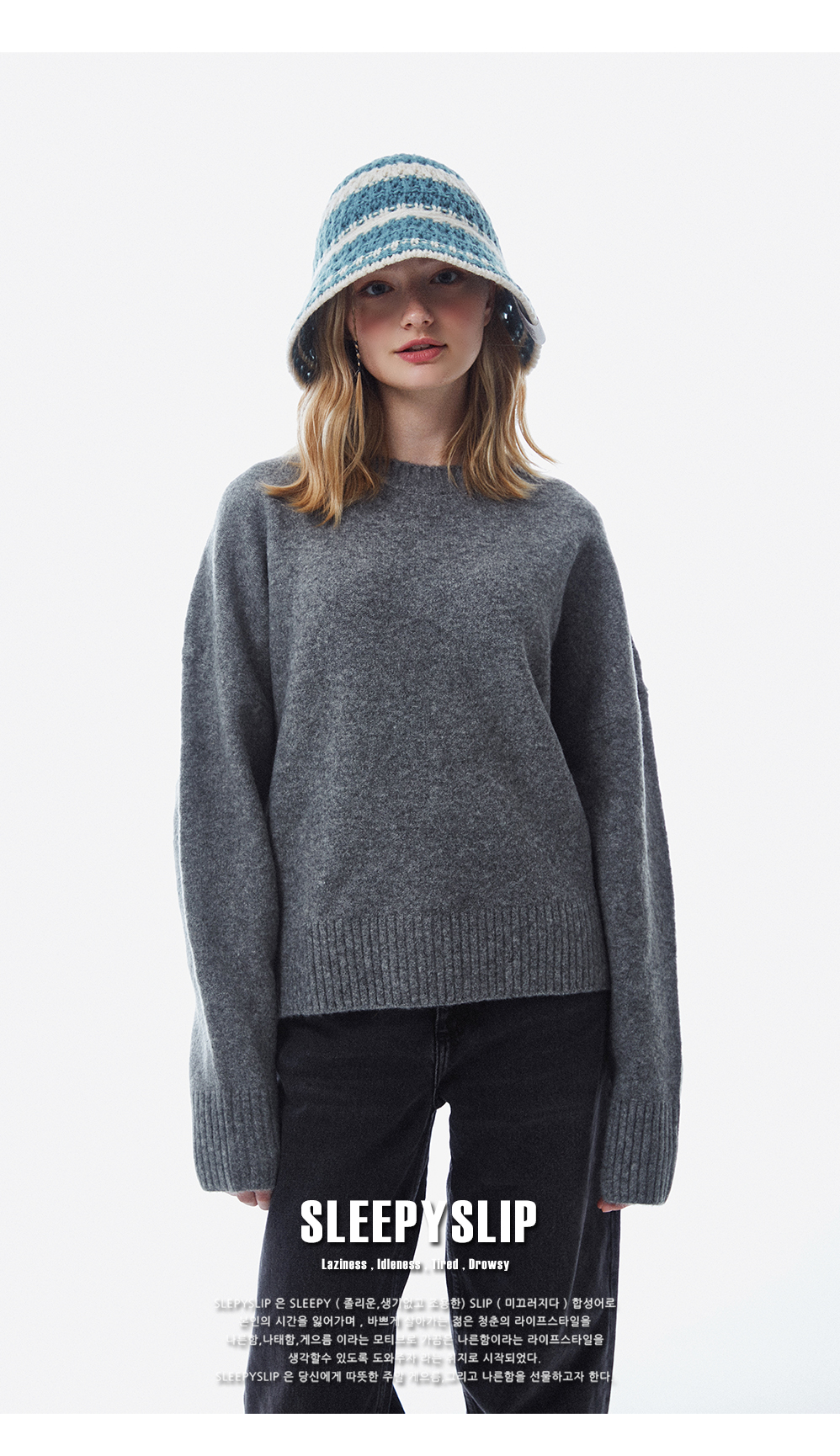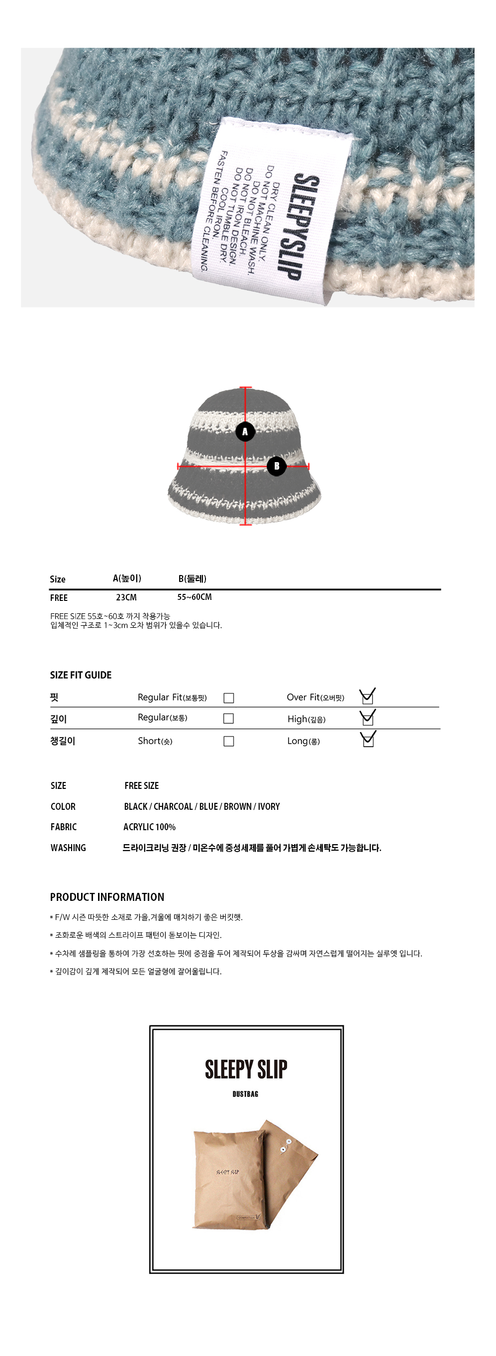 스트링 디테일로 안정감 있게 착용되는 니트 비치 버킷햇