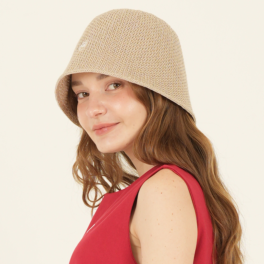 스트링 디테일로 안정감 있게 착용되는 니트 비치 버킷햇