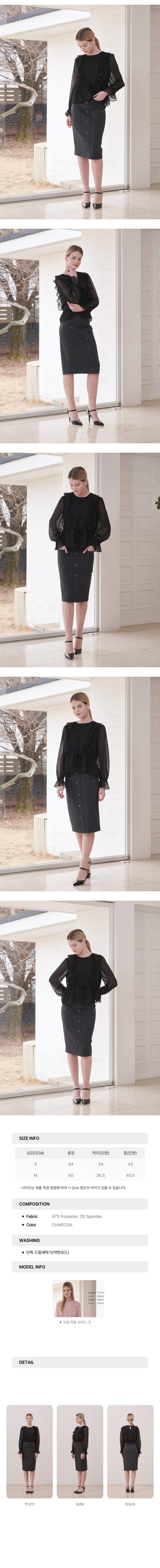 스트레치가 있는 코튼/레이온 소재의 스커트로 앞 뒤 라인에 절개 디자인을하여 날씬해보입니다.
