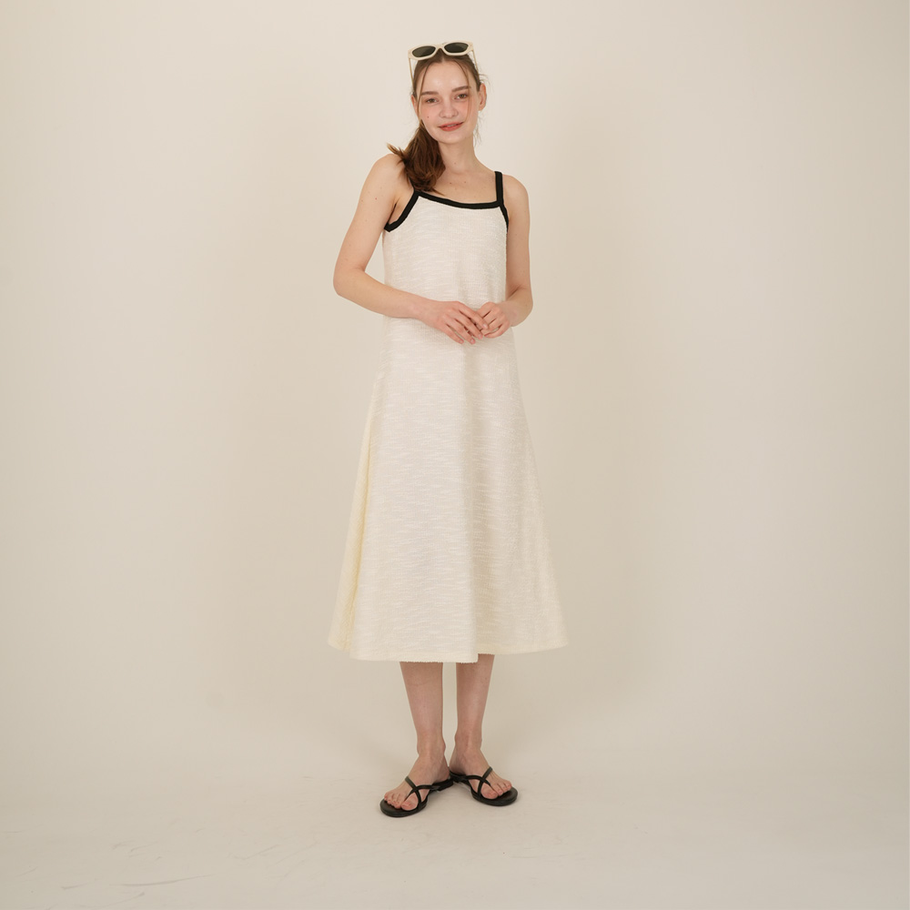 텐셀 린넨 혼방원단으로 흐르는 텍스처가 고급스러운 무드를 자아내고 세미벨라인의 슬리브리스 드레스로 벨르마만의 퀄리티와 슬림한 핏을 연출합니다.