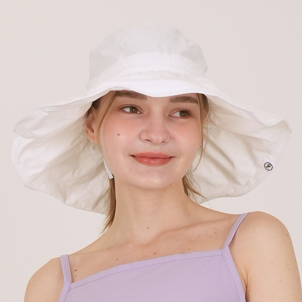 스트링 디테일로 안정감 있게 착용되는 니트 비치 버킷햇