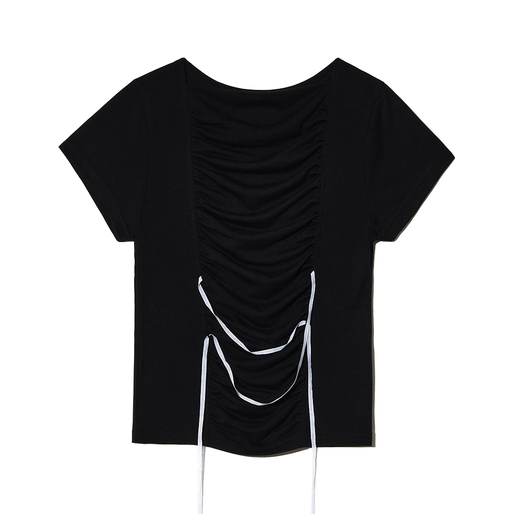 레이스 타이 스카프 디테일로 여성스러움을 더한 반팔 티셔츠