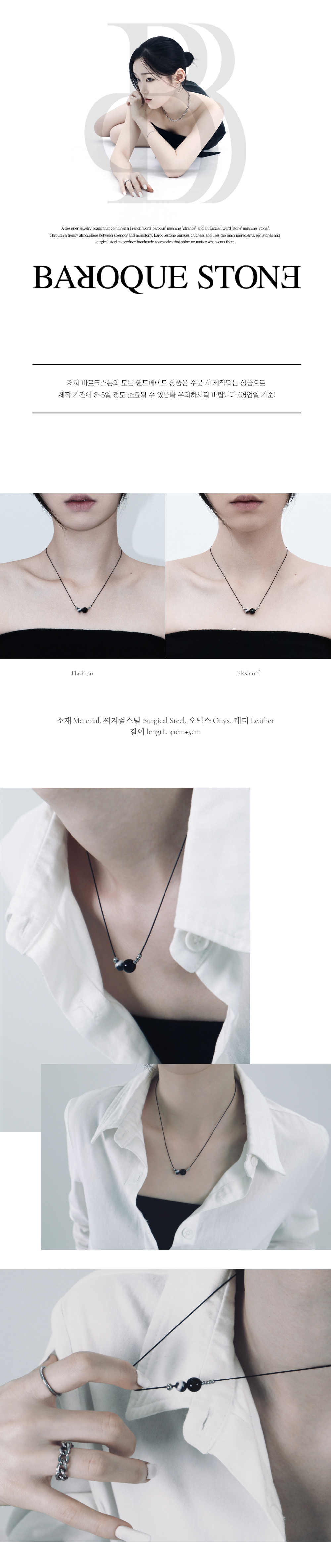 블랙 색상의 줄에 얼룩무늬 원석과 오닉스 원석, 써지컬볼을 추가하여 만든 포인트 목걸이