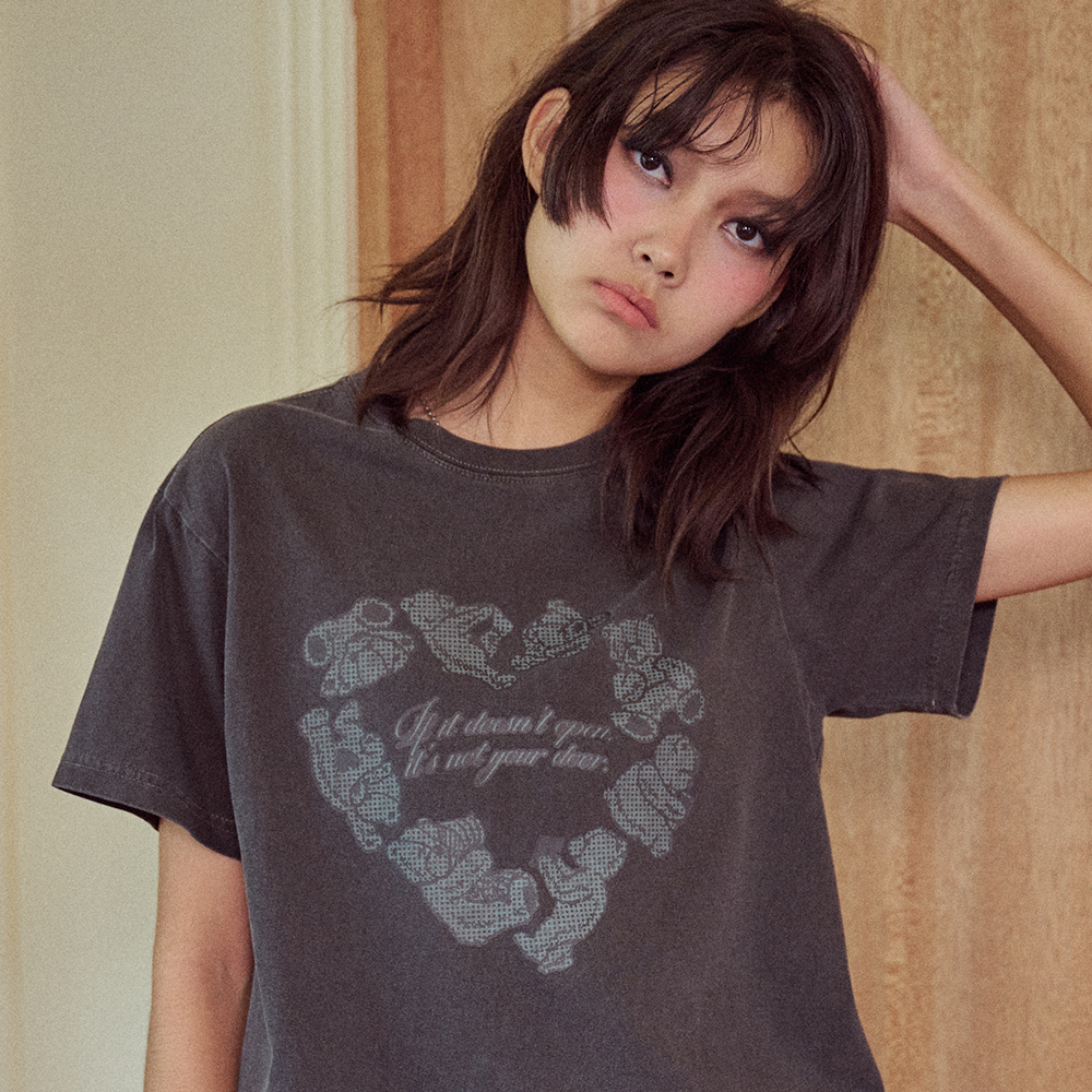 아트웍이 피그먼트 워싱되며 가공 처리하여 유니크한 무드를 연출했습니다.