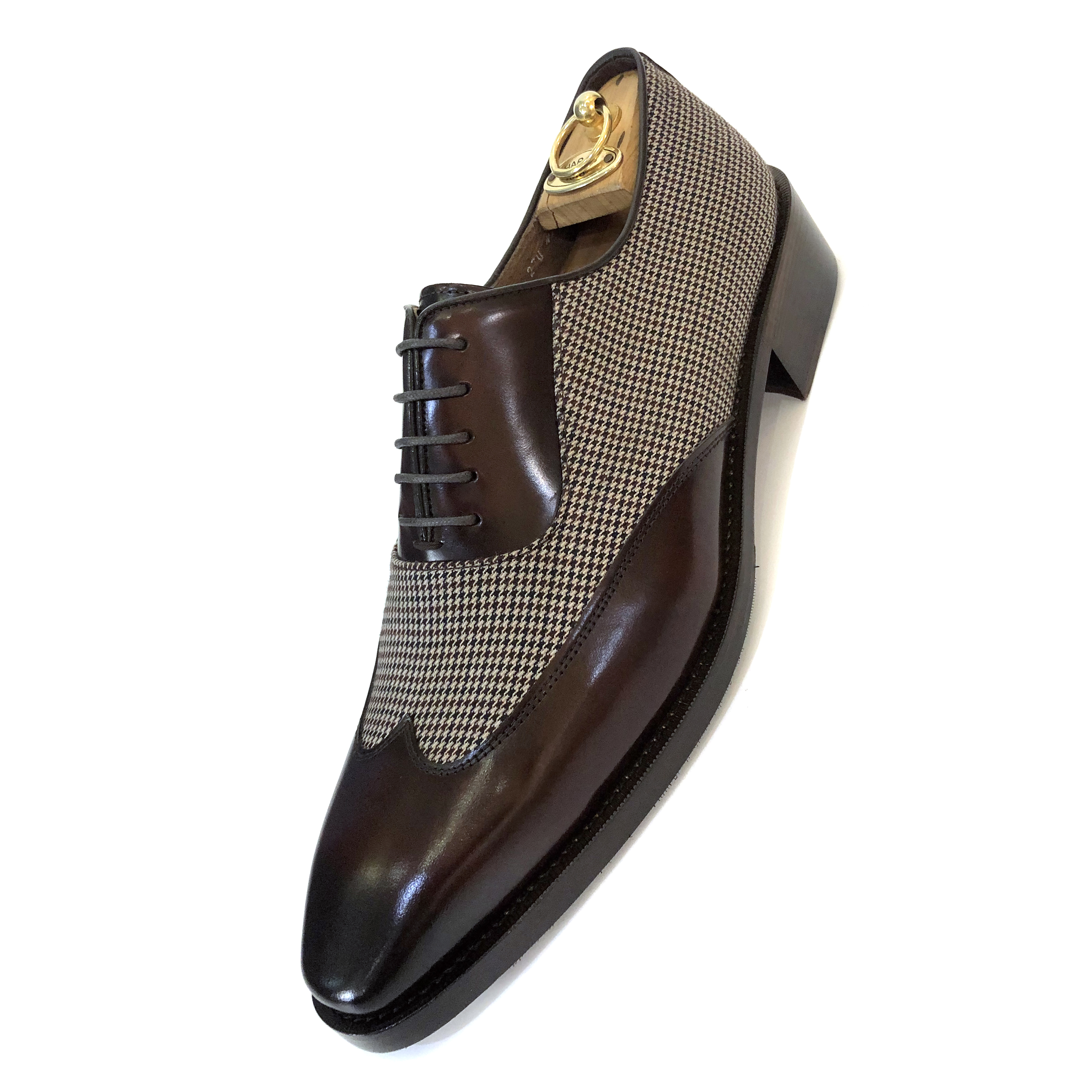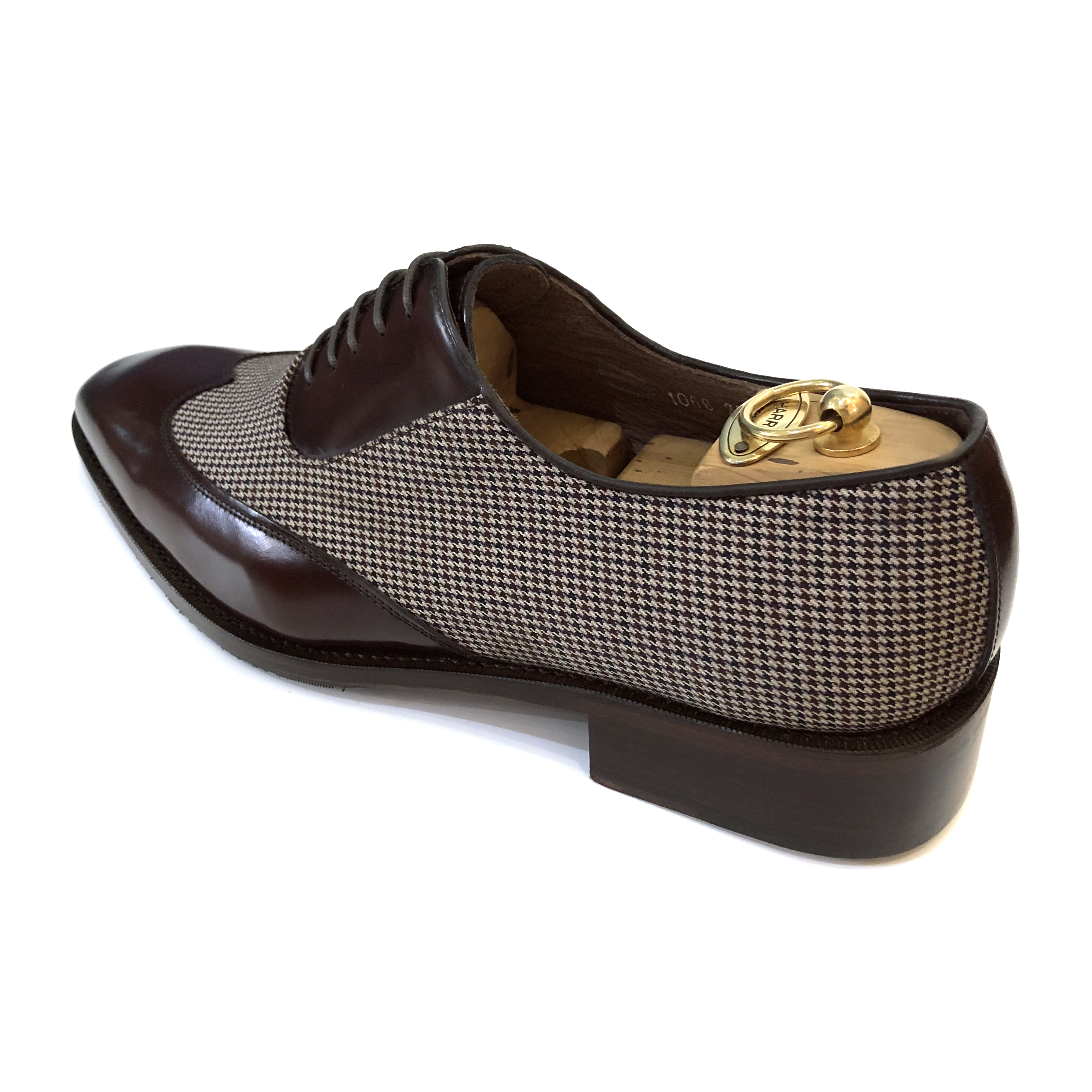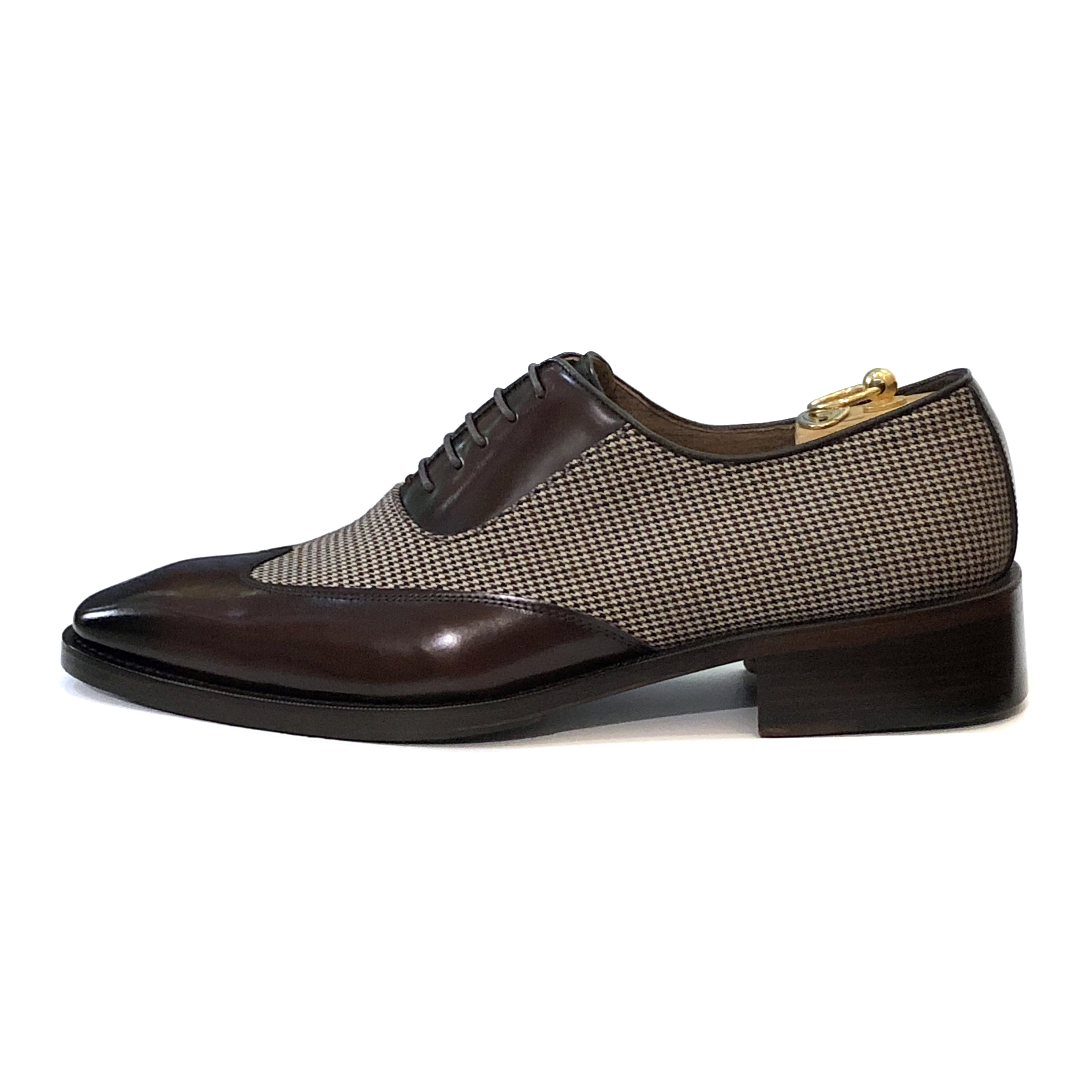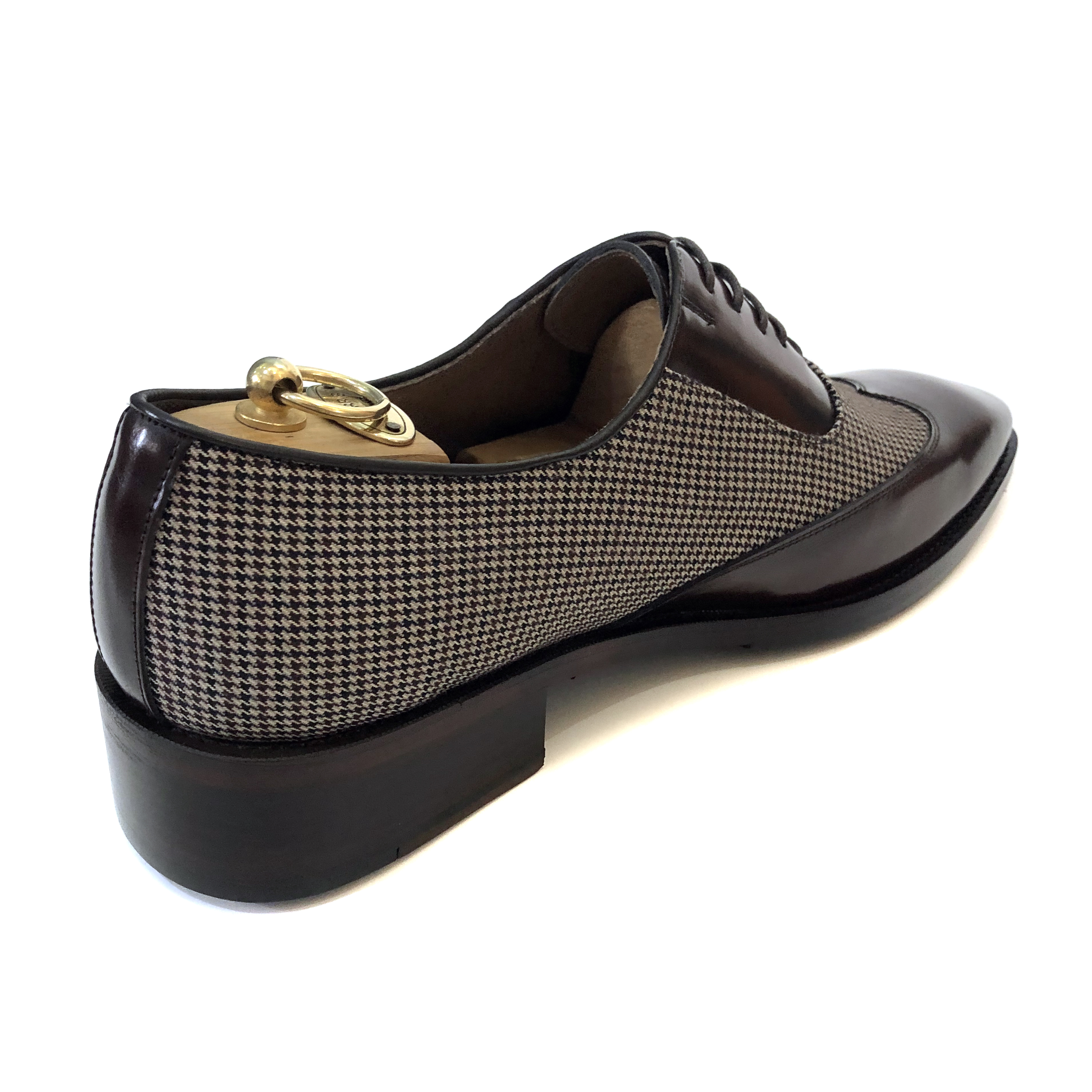 다크 브라운 소가죽과 체크 원단의 조합으로 세련되고 독특한 디자인을 자랑합니다.