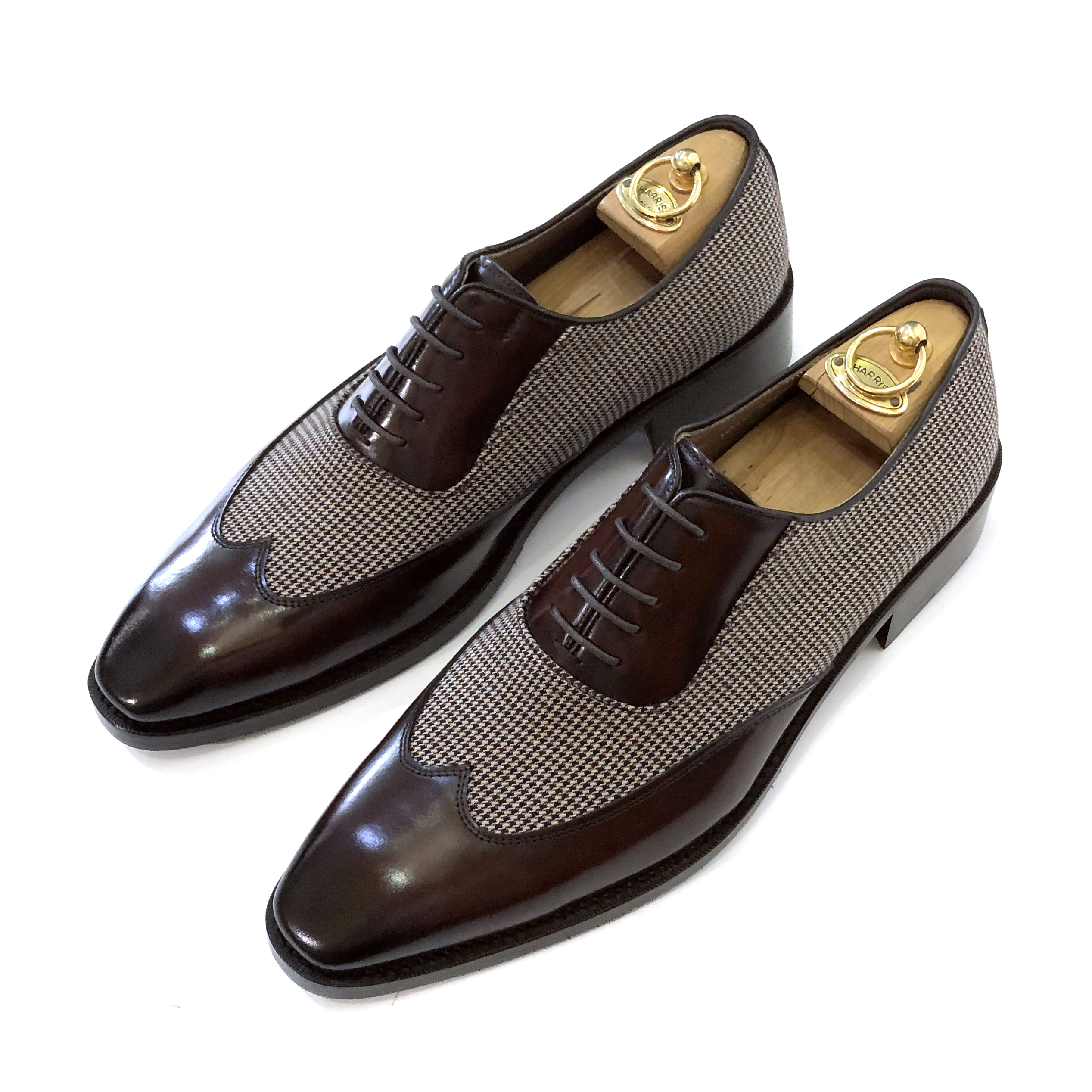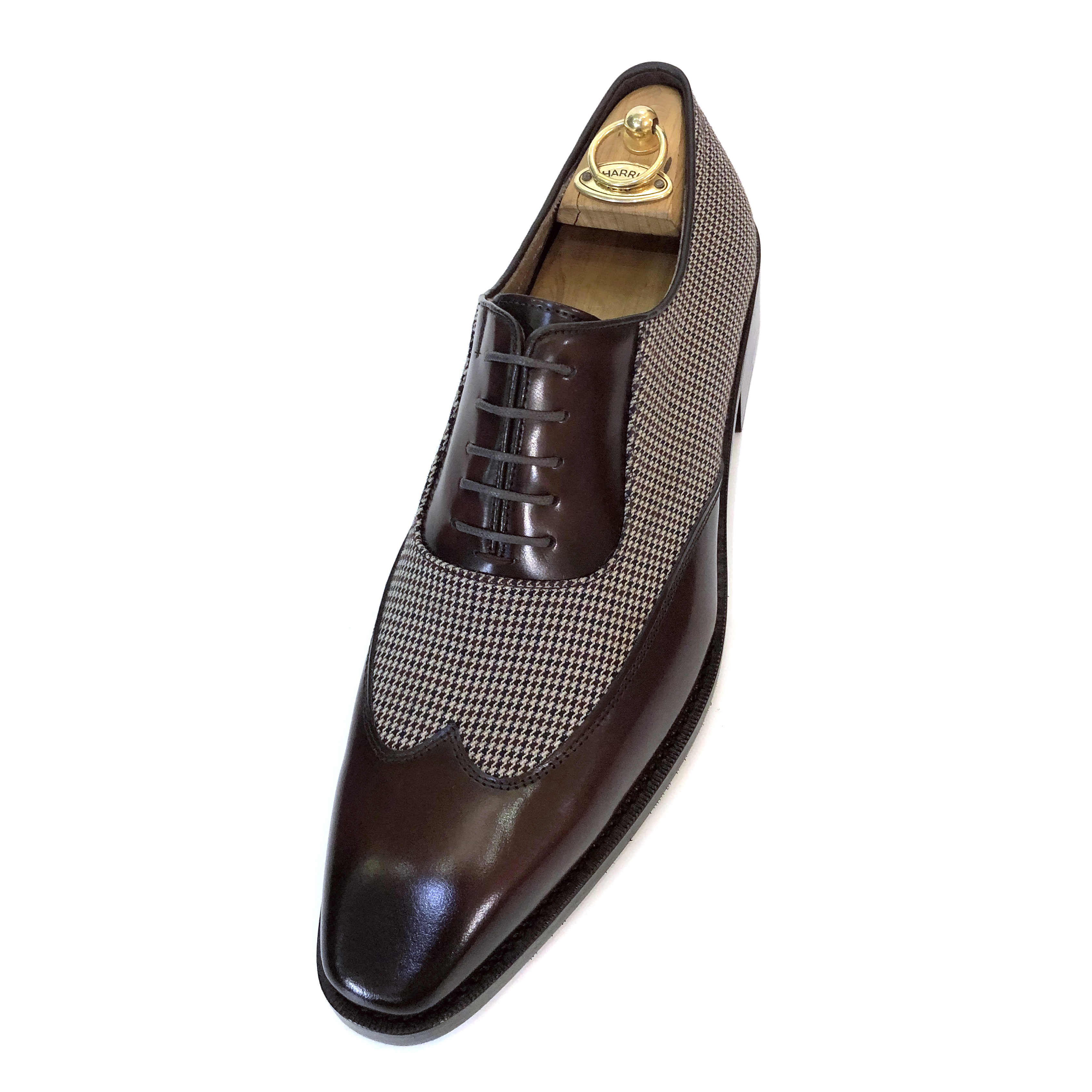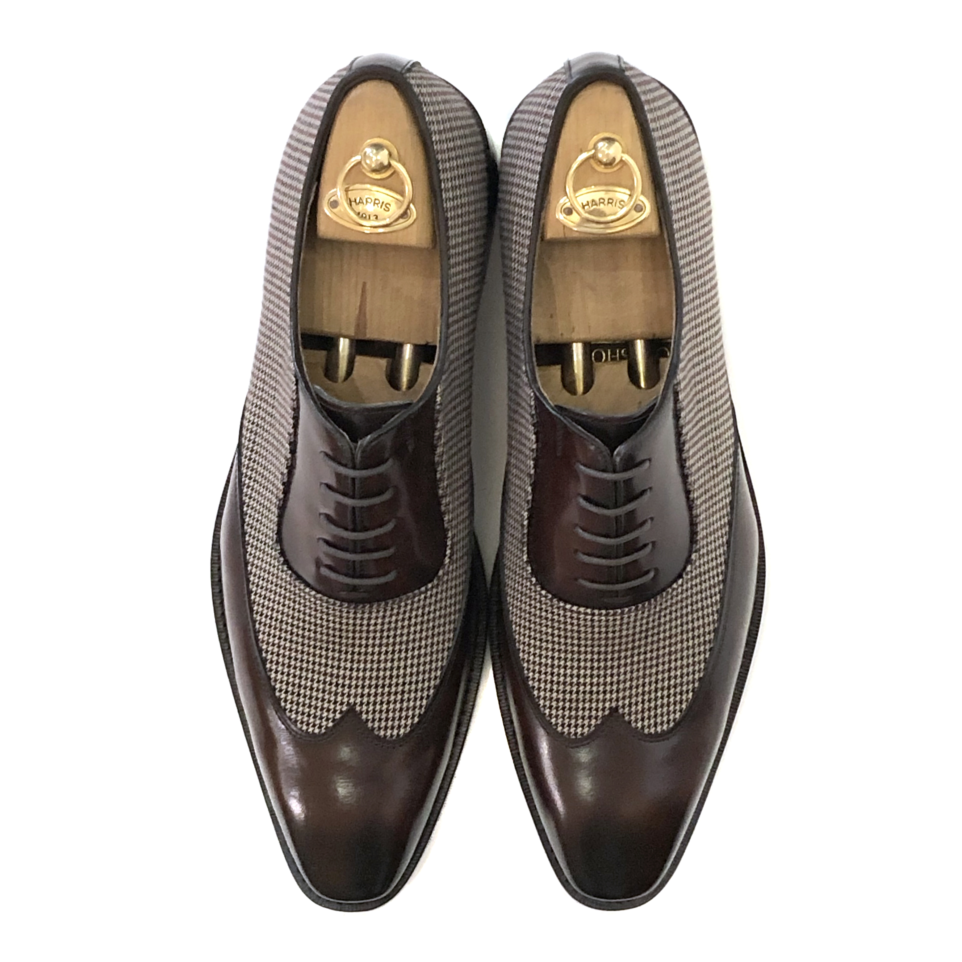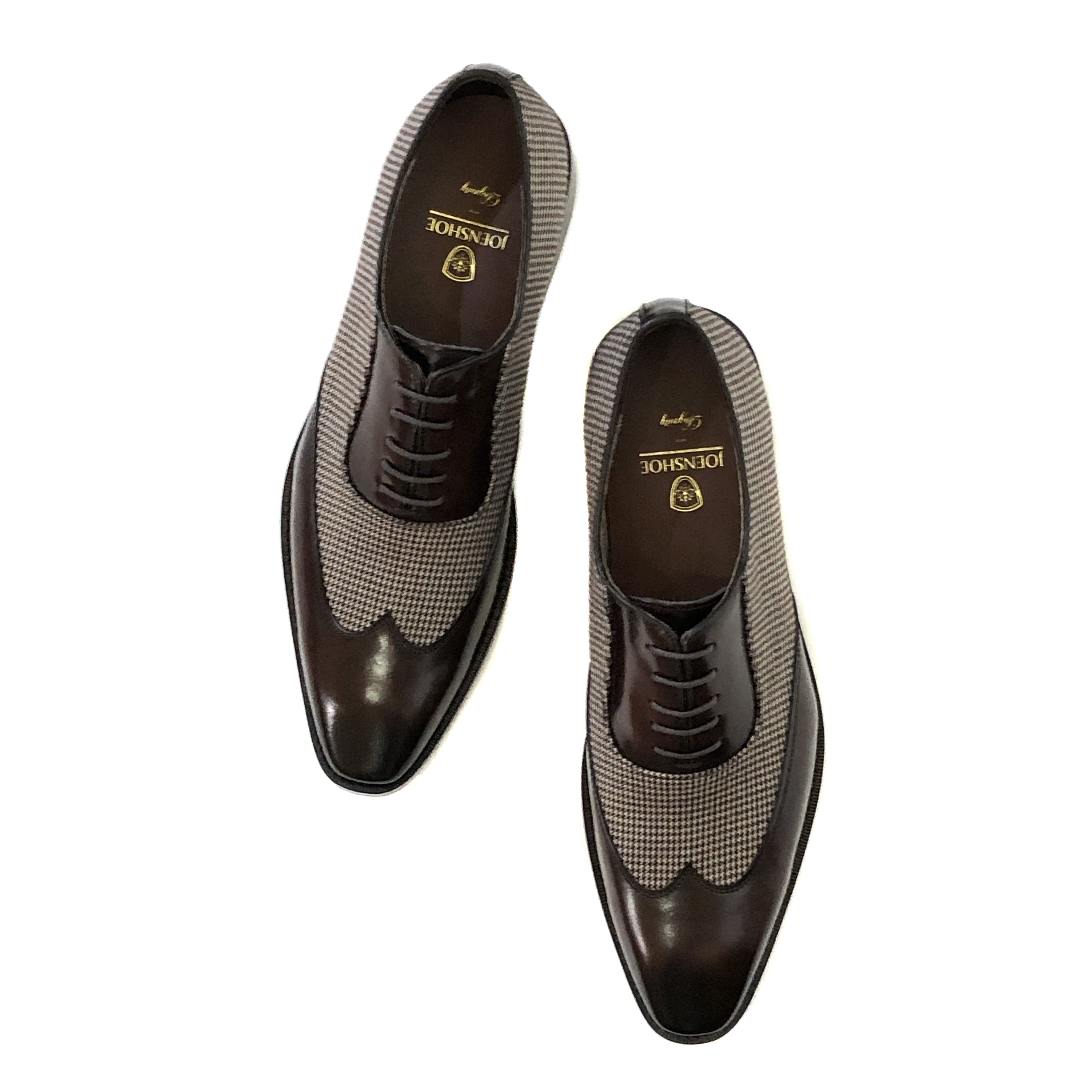다크 브라운 소가죽과 체크 원단의 조합으로 세련되고 독특한 디자인을 자랑합니다.
