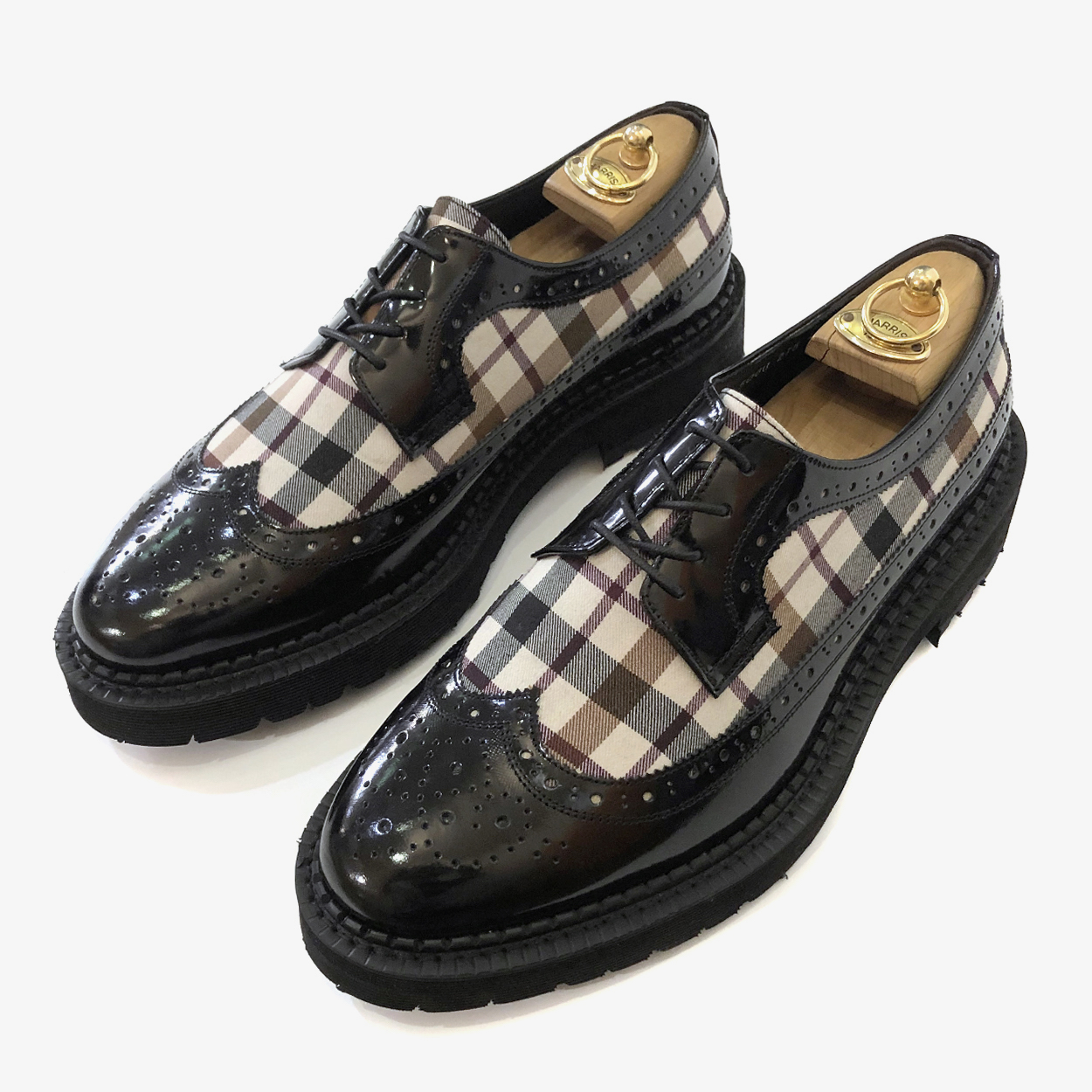 헤이마켄 체크 원단과 블랙 소가죽의 조화로 세련되고 독창적인 디자인을 자랑합니다.