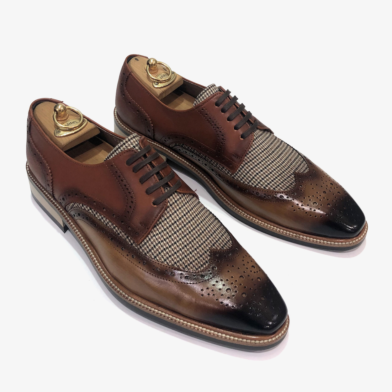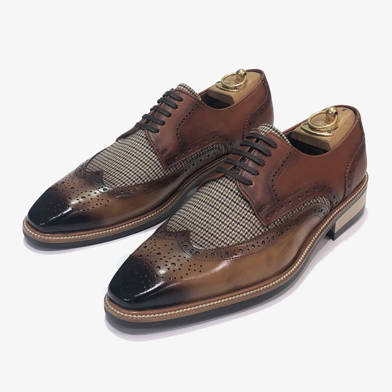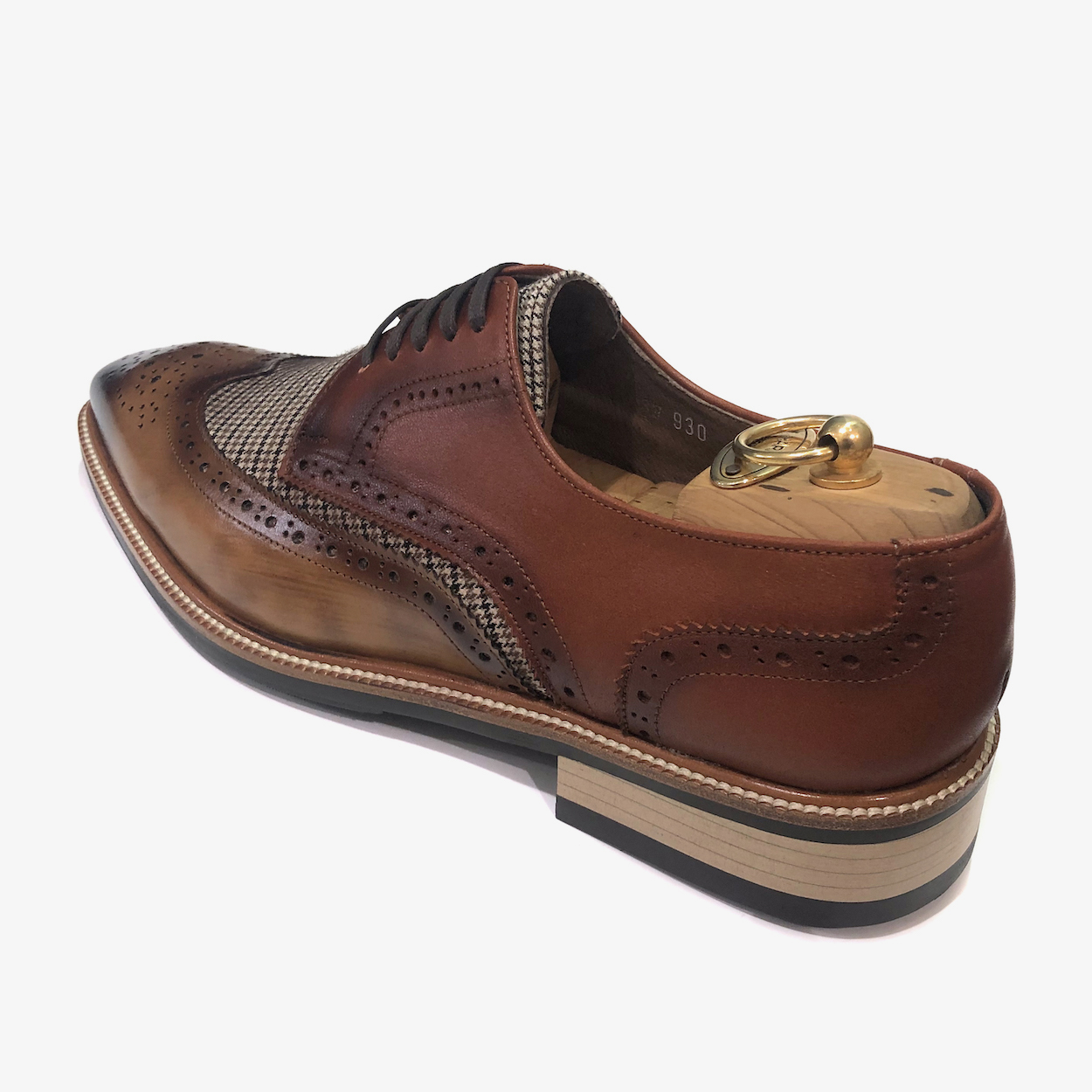 : 두 가지 브라운 소가죽이 조화롭게 어우러져 고급스럽고 세련된 느낌을 줍니다.