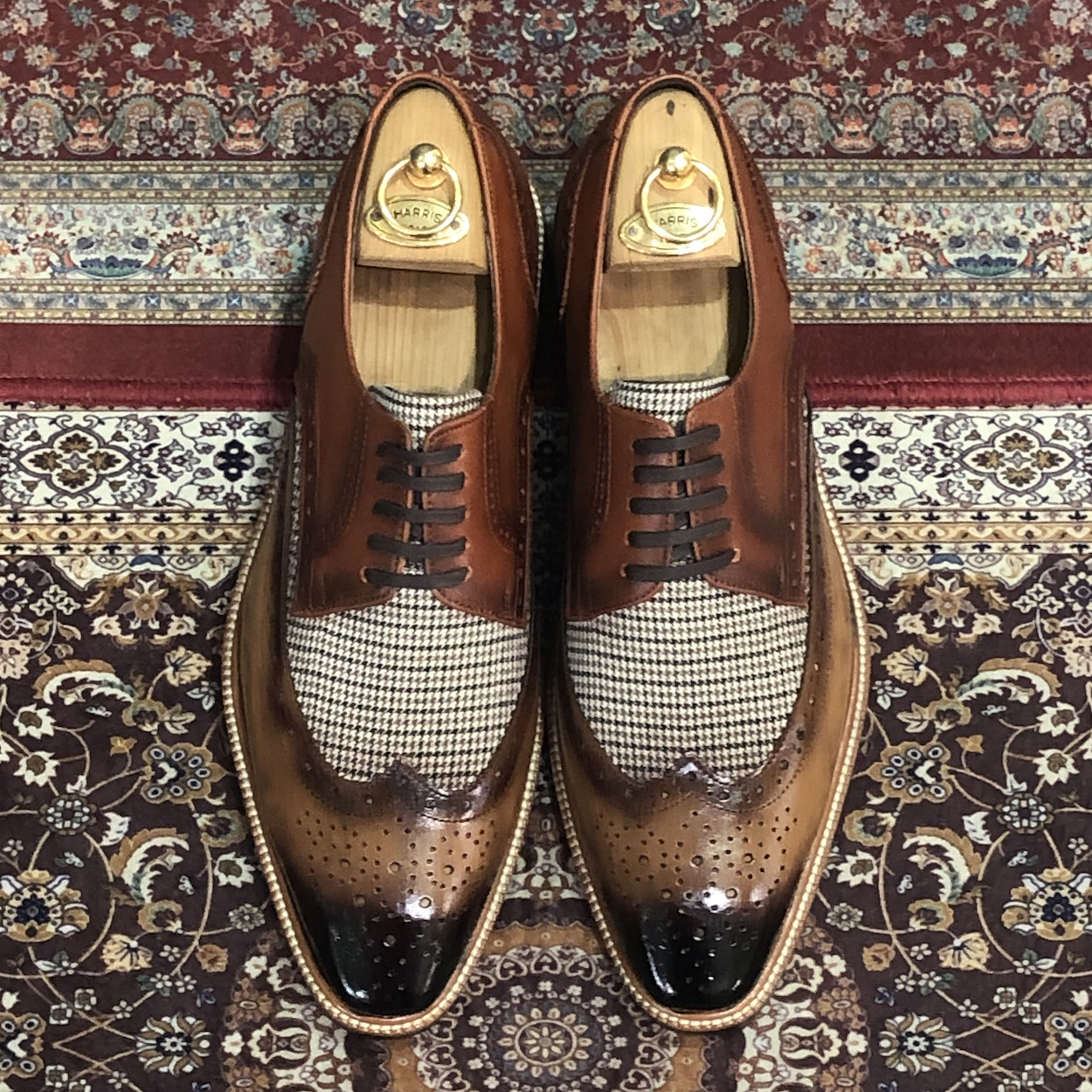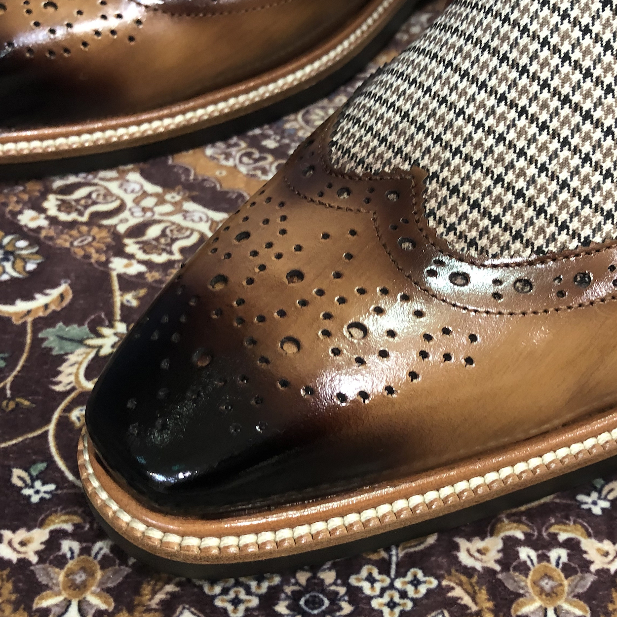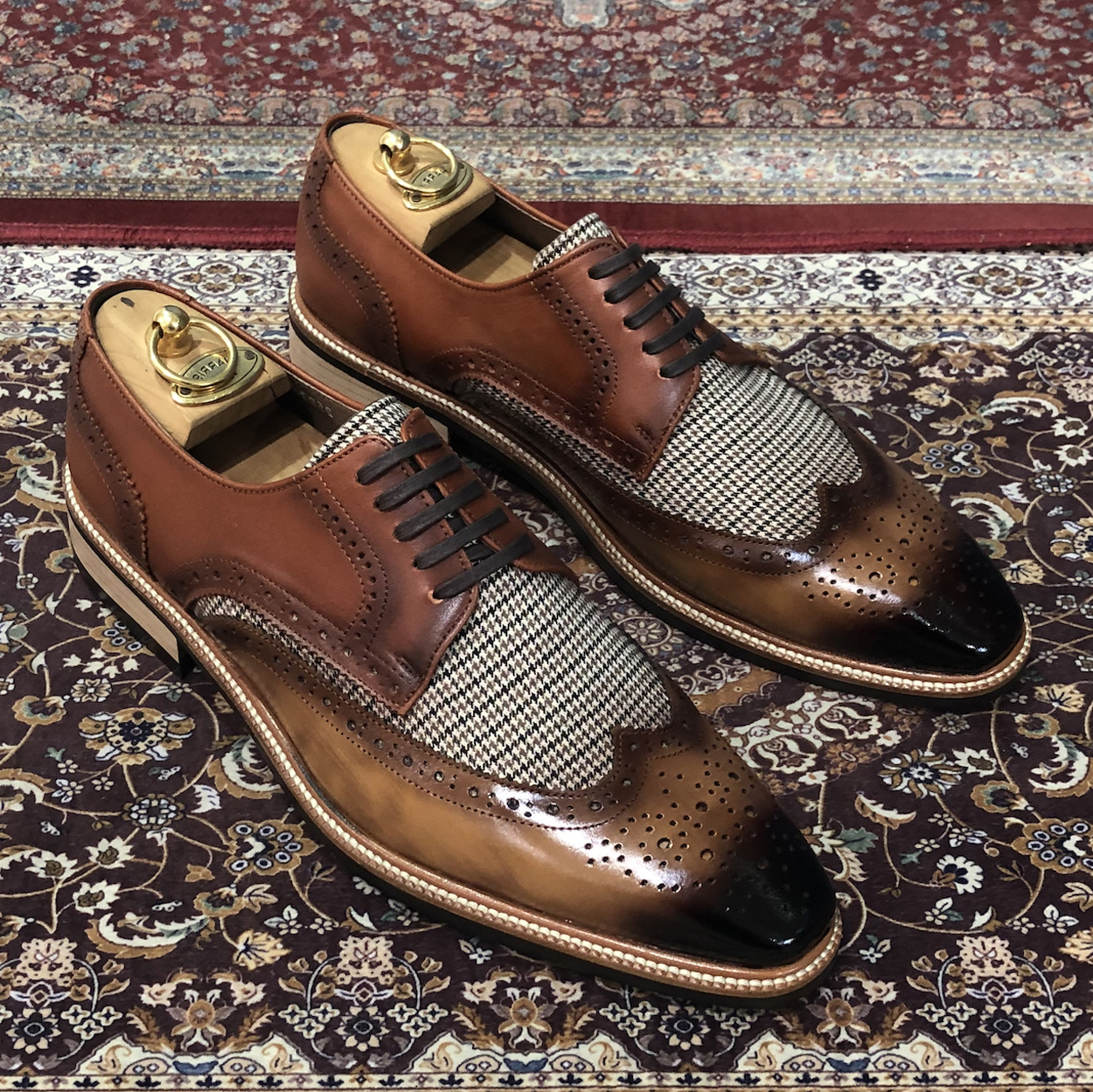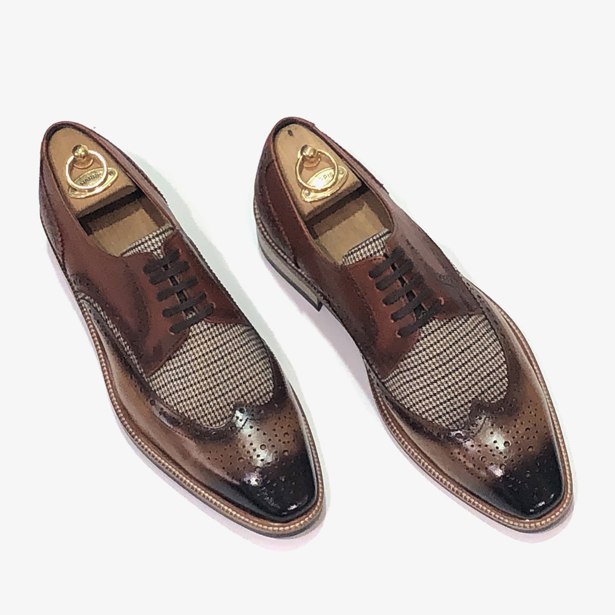 : 두 가지 브라운 소가죽이 조화롭게 어우러져 고급스럽고 세련된 느낌을 줍니다.