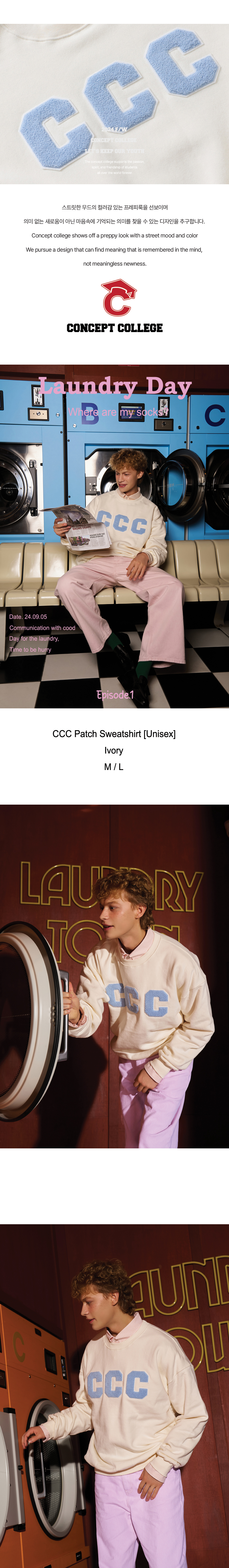 가슴에 컨셉트 컬리지의 심볼인 C보풀 패치가 트리플로 디자인된 스웨트셔츠입니다.
