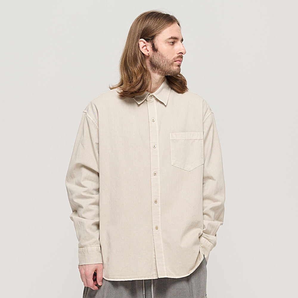 데님 소재로 제작된 오버핏의 플리츠 셔츠