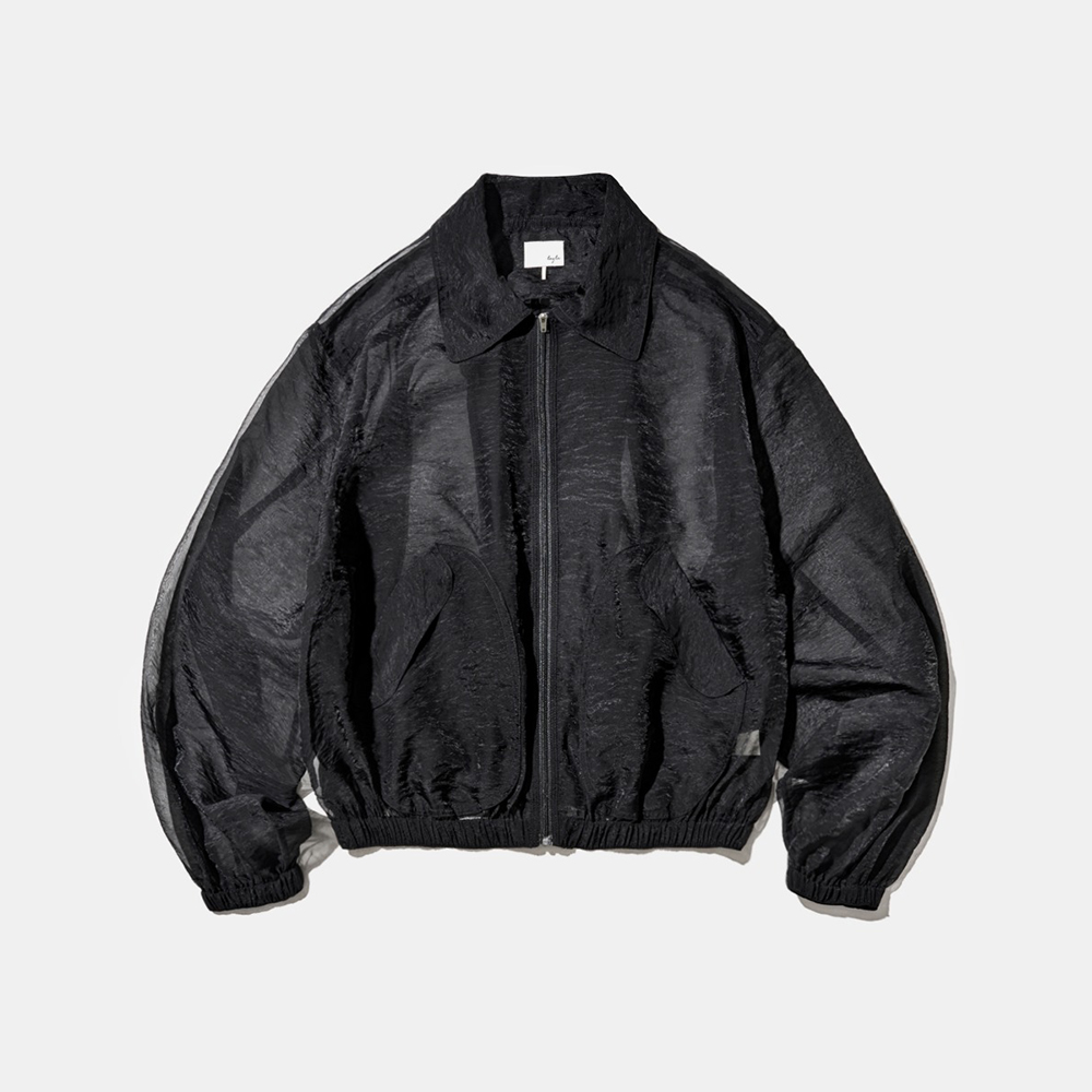특유의 반투명한 광택감과 섬세한 텍스처가 돋보이는 얇고 가벼운 오간자 소재의 블루종 자켓
