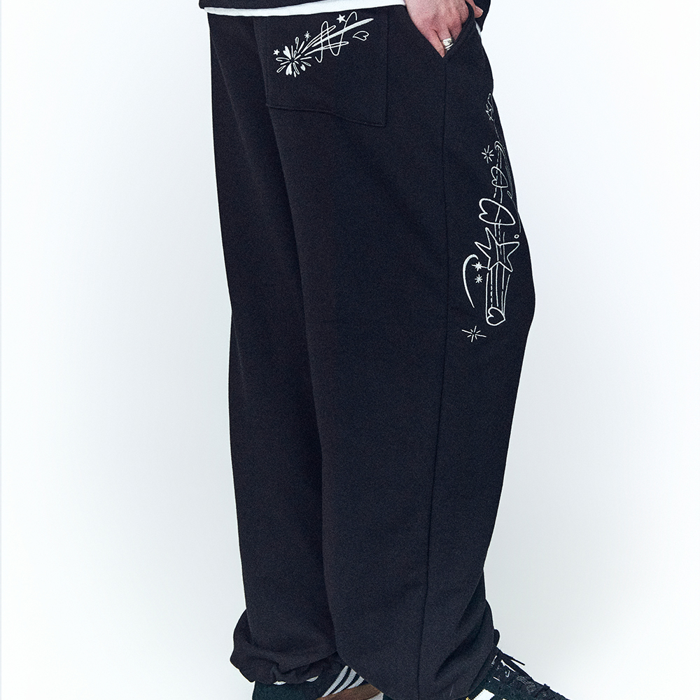 와이드한 패턴으로 볼륨감 있게 연출되며 전면에 그래픽 디자인이 매력적인 스웨트 팬츠입니다.