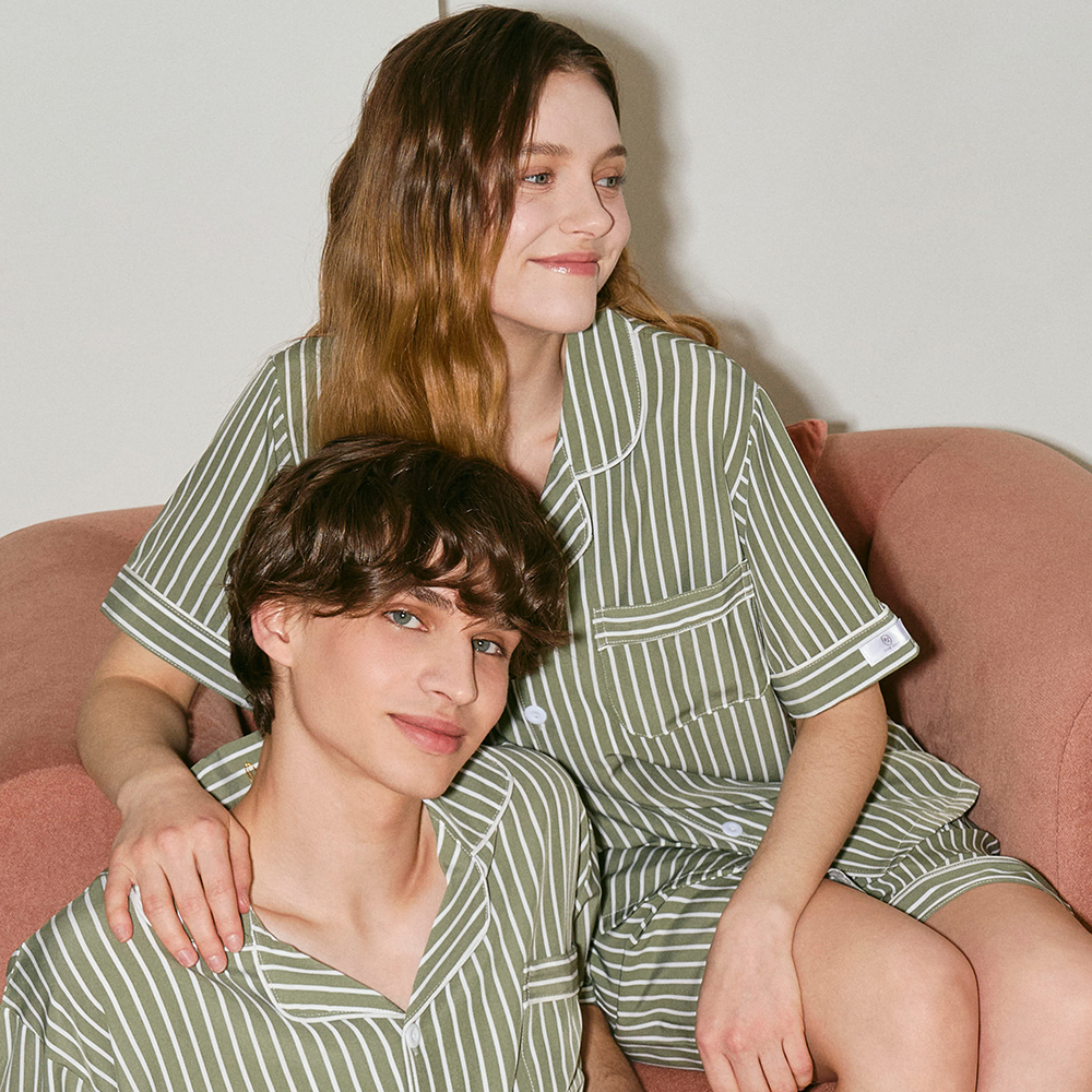 핑크존 루나 스트라이프 에그쉘 반팔 카라 투피스 잠옷 세트