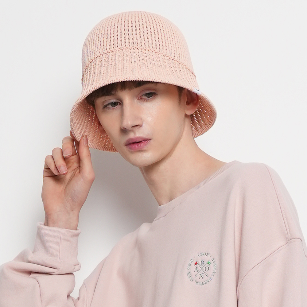 스트링 디테일로 안정감 있게 착용되는 니트 비치 버킷햇