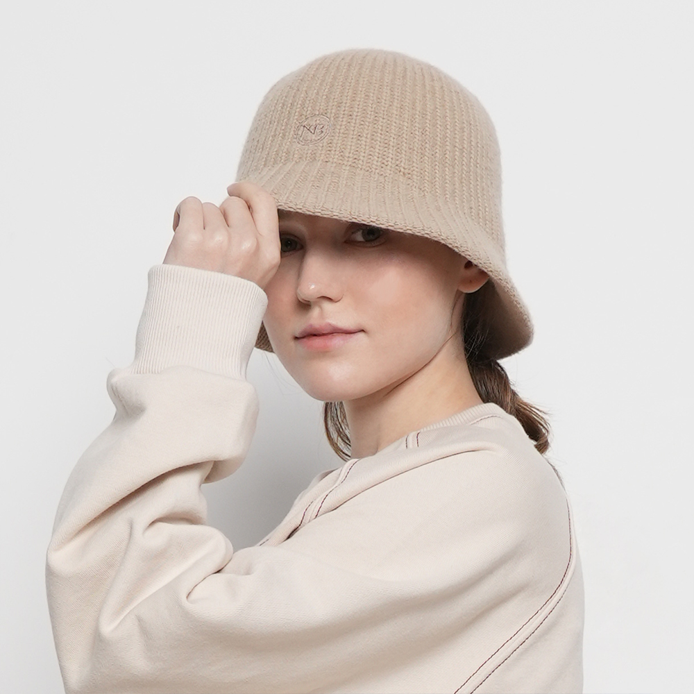 스트링 디테일로 안정감 있게 착용되는 니트 비치 버킷햇