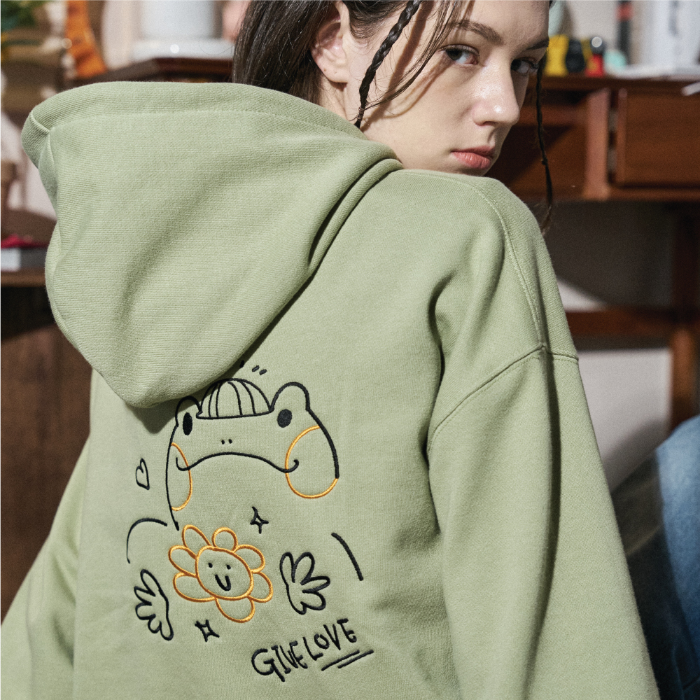 刺繍がきれいで締まってこんにちは、お客様:) 大切なレビューありがとうございます。私も商品の裏板にあるカエルの刺繍がとても可愛いと思います><そこにまた可愛い花刺繍まで!フードの色も負担にならず、デイリーで楽に着られると思います。フードがゆったりとしたフィットで出てきて、ワイドパンツとマッチしてもいいようですね:) GVGをご利用いただきありがとうございます!