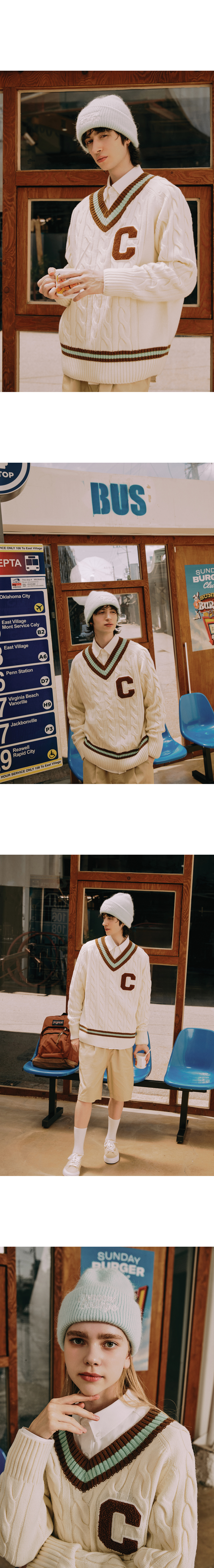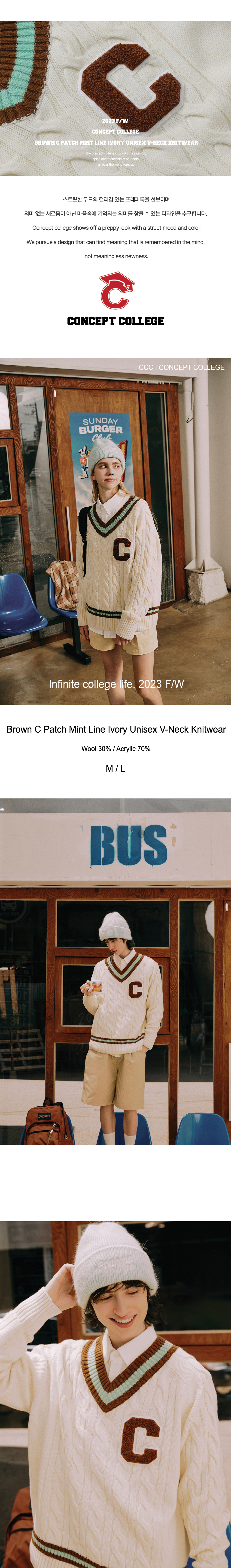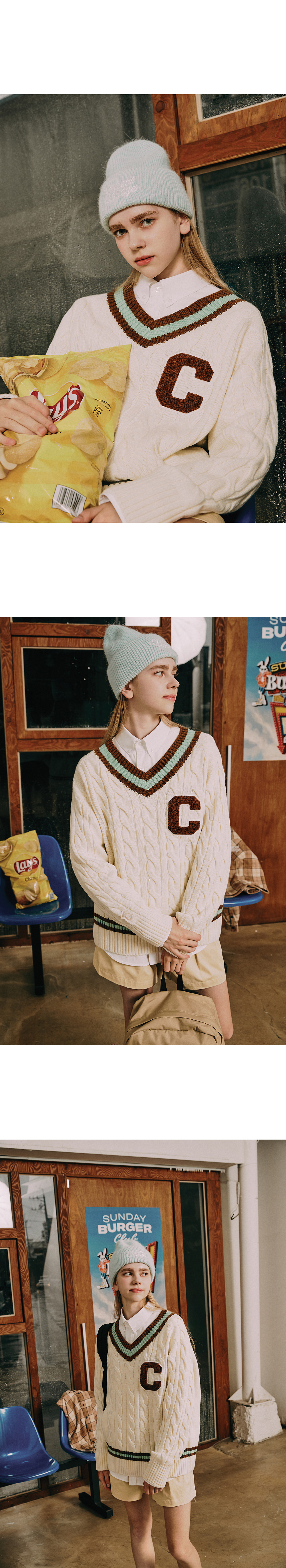 ブラウン Cパッチ ミントライン アイボリー Vネックニット(ユニセックス)