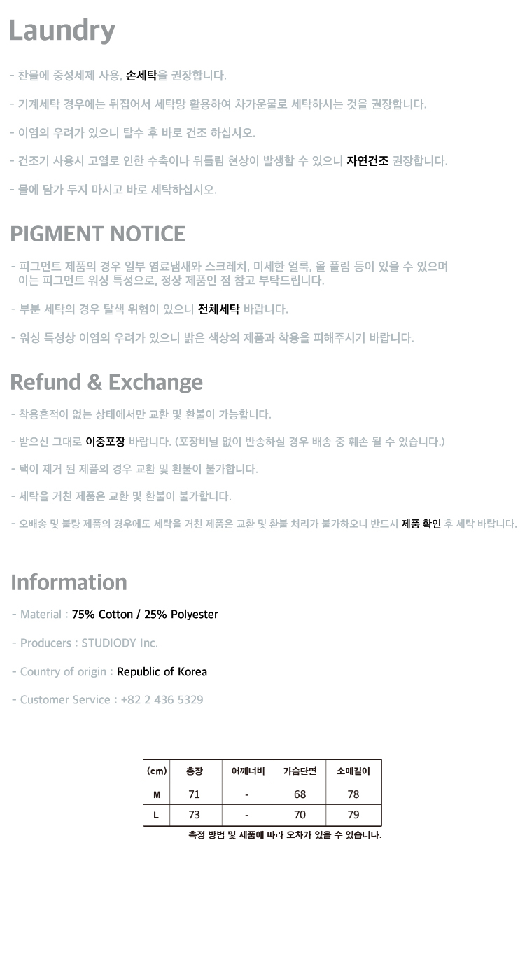 높은 중량감의 3단 쭈리 기모 원단과 복원력이 강한 고밀도의 2x1 RIP을 사용했습니다.
