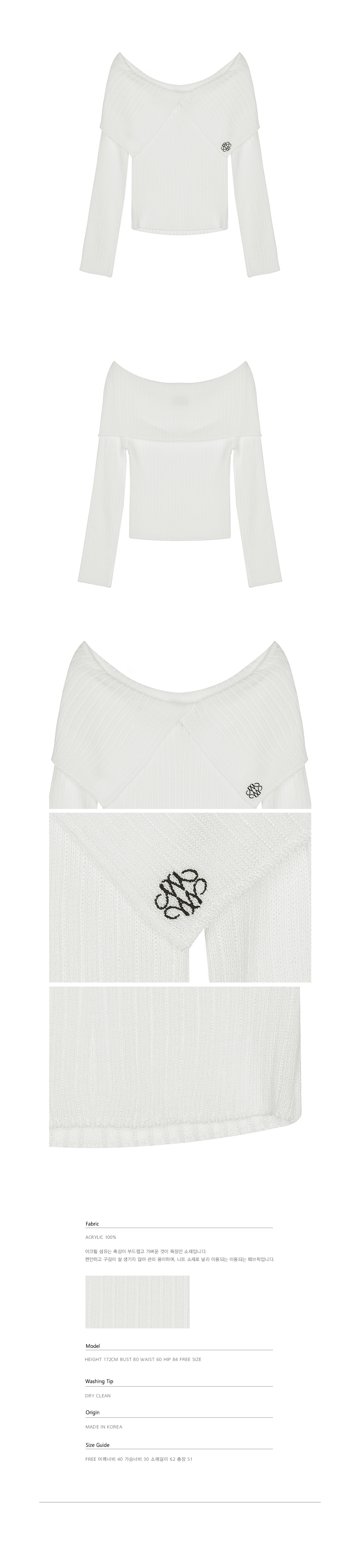 넓은 플랩 형태의 넥라인과 함께 골지 원단의 신축성으로 바디라인을 잡아주어 슬림핏으로 페미닌한 느낌을 주는 니트입니다.
