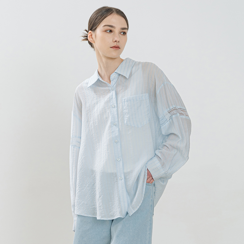 네크를 따라 흐르는 러플과 시스루한 소재가 여성스러운 느낌을 주는 블라우스예요.