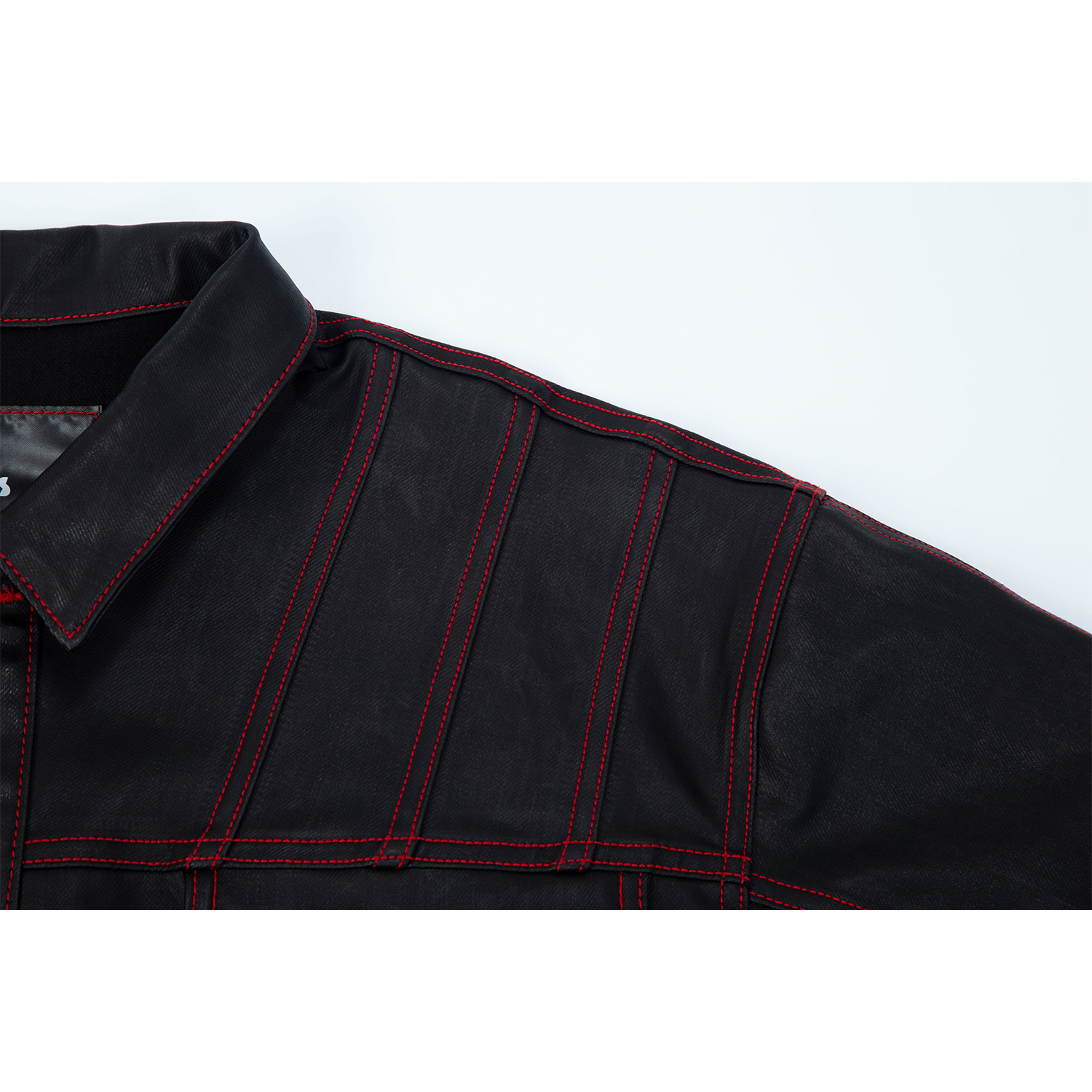 어깨의 레드컬러 아일렛이 돋보이는 케이아스의 폴드윙 데님자켓입니다