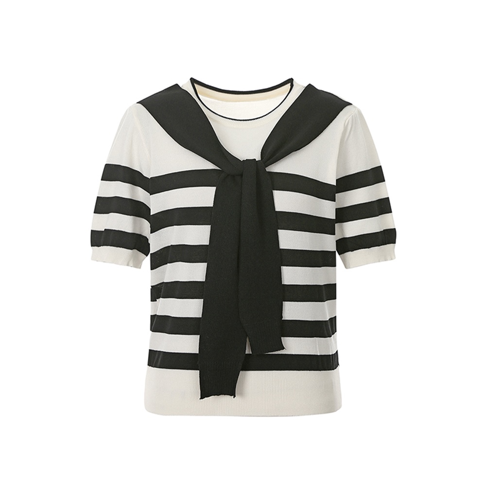 언밸런스 숄더 디자인의 스트라이프 니트