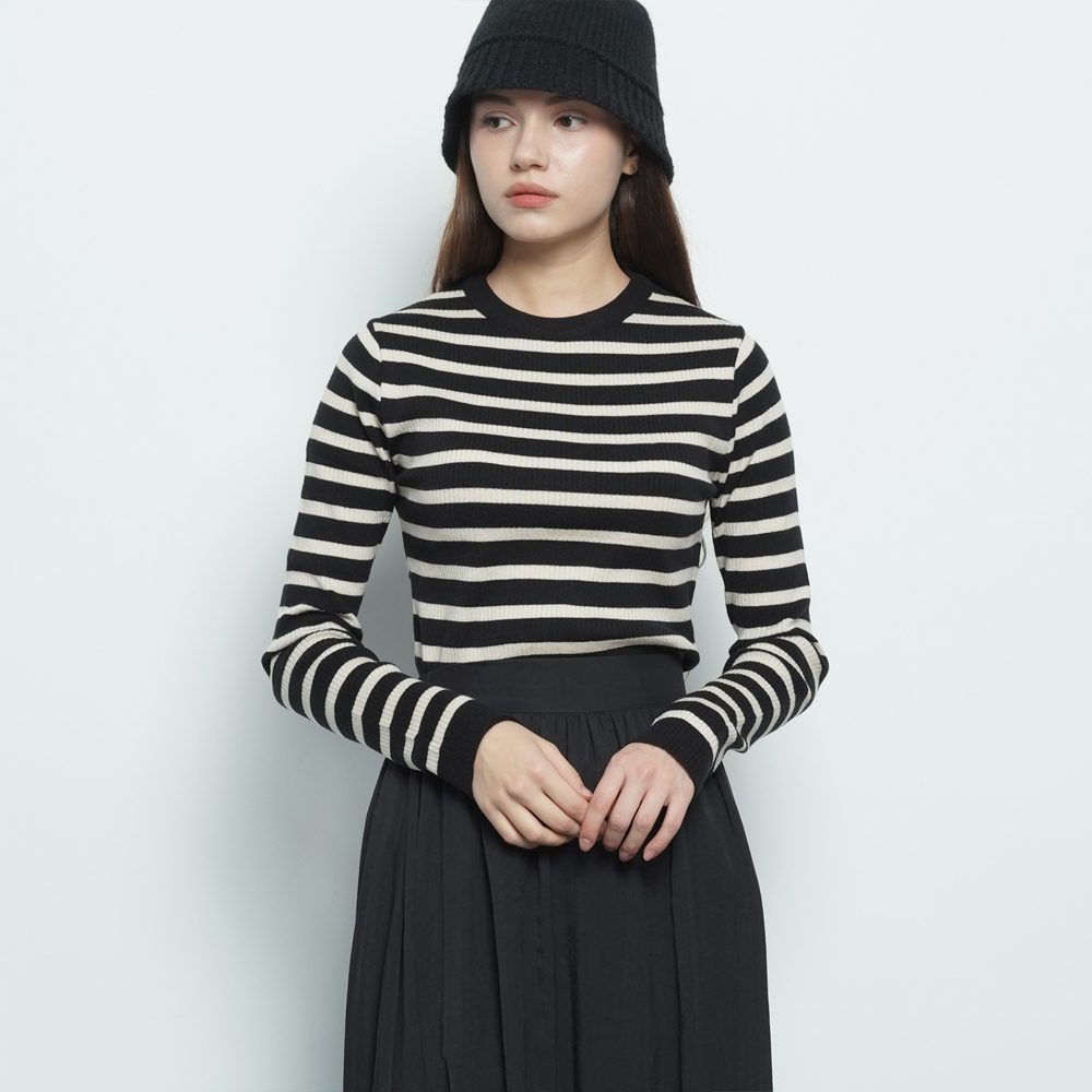 깔끔한 스트라이프 패턴과 폴로넥 디테일로 감각적인 무드를 더한 반팔 니트