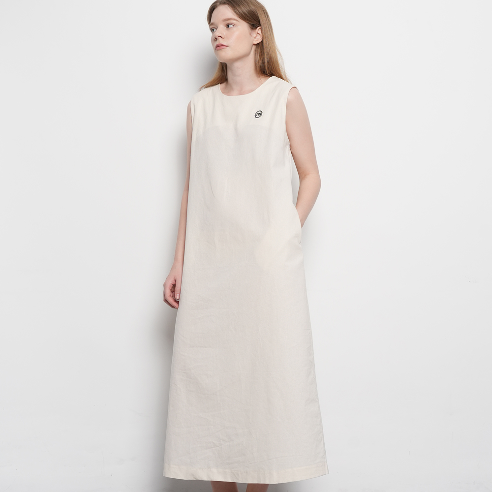 텐셀 린넨 혼방원단으로 흐르는 텍스처가 고급스러운 무드를 자아내고 세미벨라인의 슬리브리스 드레스로 벨르마만의 퀄리티와 슬림한 핏을 연출합니다.