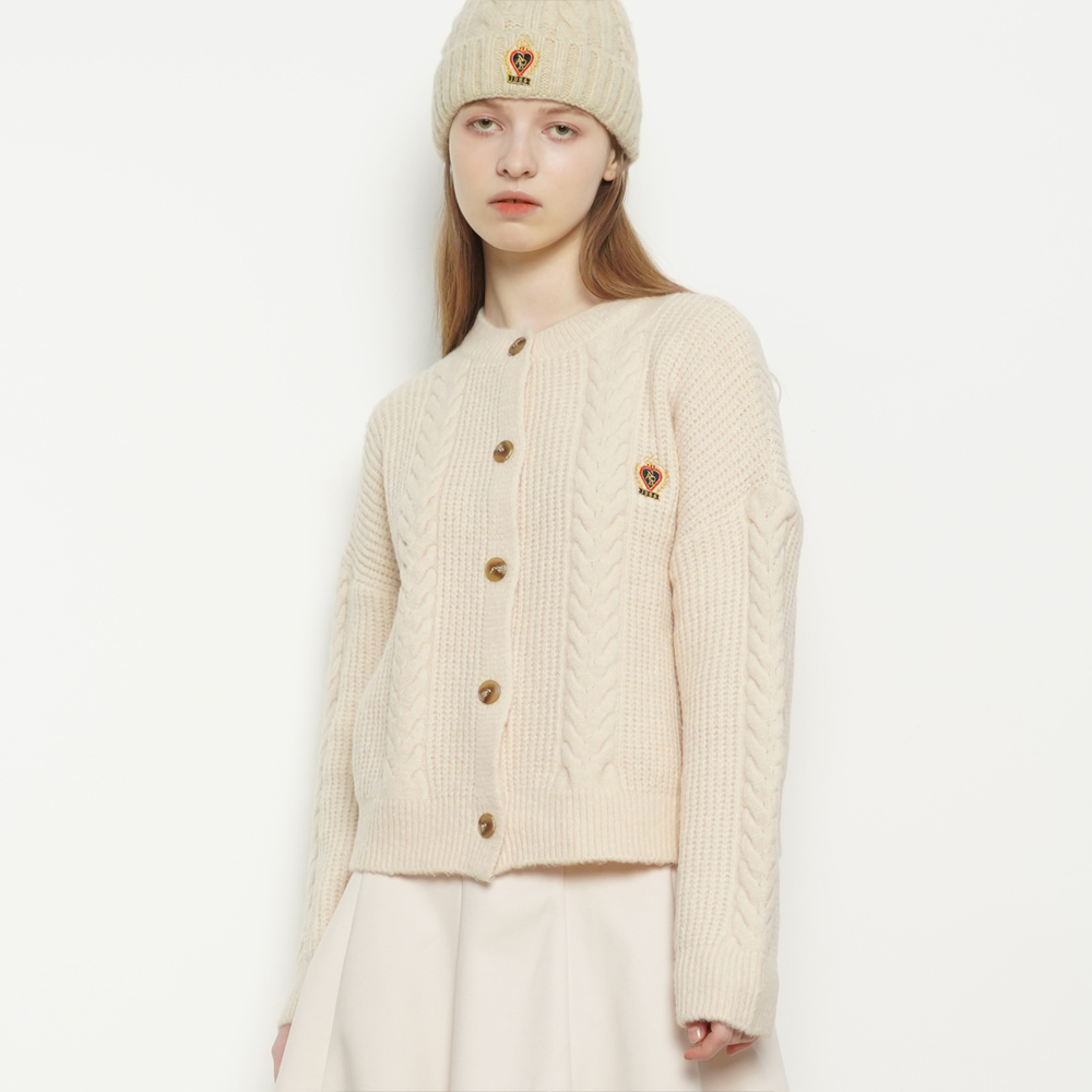 클래식하고 베이직한 꽈배기 조직과 볼드하지 않은 미디움 사이즈의 패턴으로 캐주얼한 디자인의 브이넥라인 니트 가디건 입니다.
