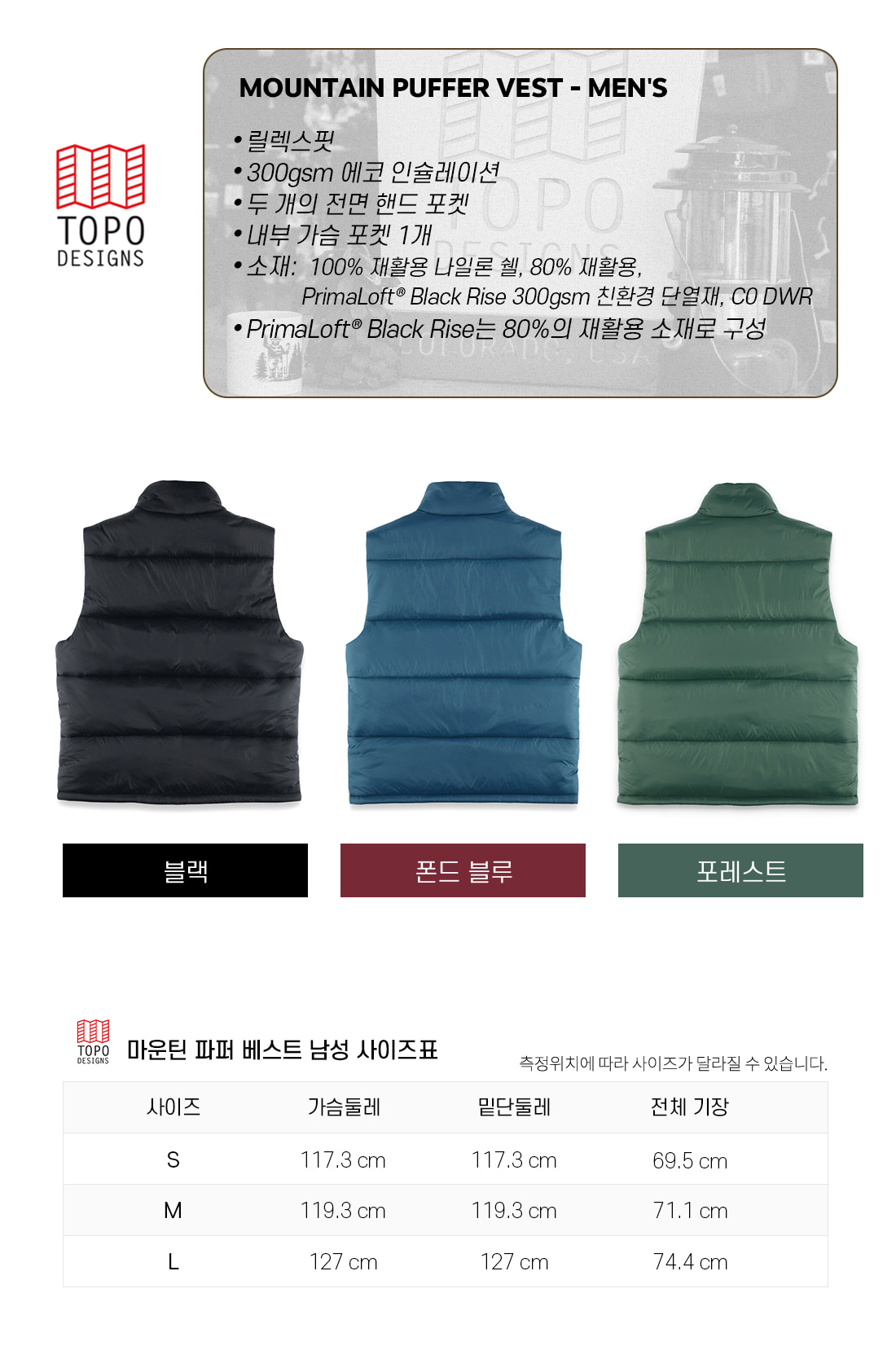[토포디자인] 마운틴 파퍼 베스트 남성 패딩조끼 - 폰드블루