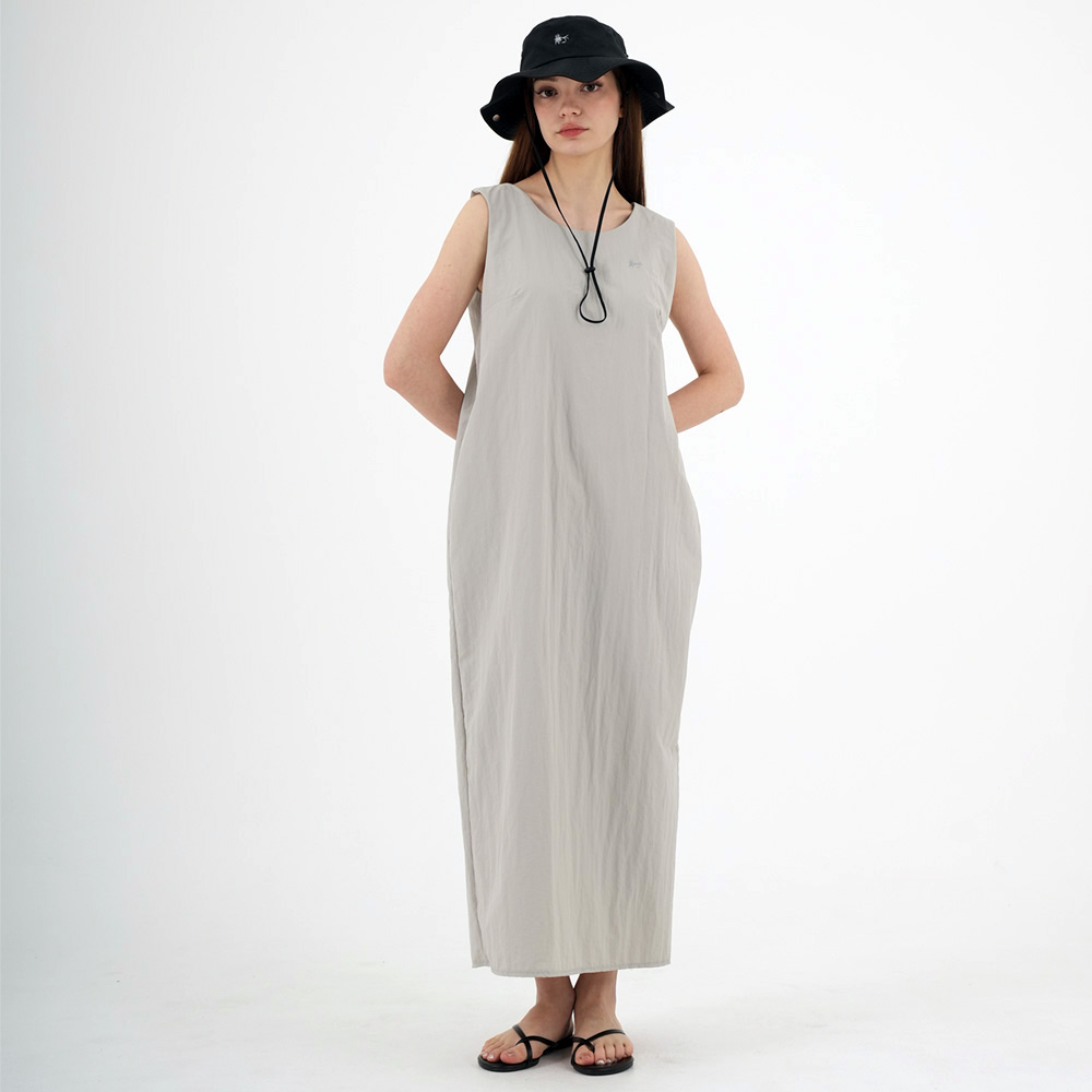 린넨소재의 여름 바캉스룩으로 백오픈 디자인의 홀터넥드레스