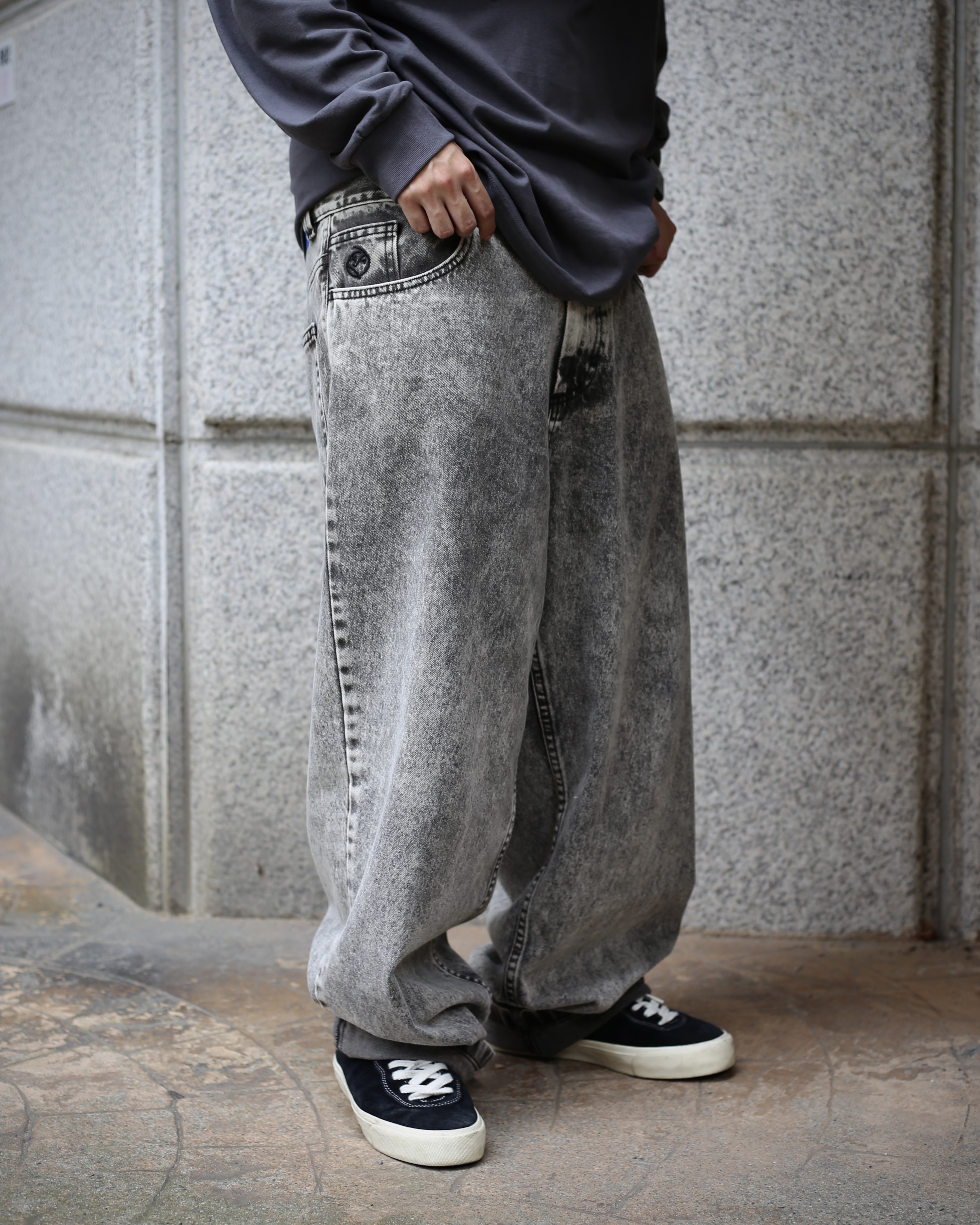 슬라브원단에 빈티지한 워싱 및 오염된듯한 워싱을 한 데님팬츠