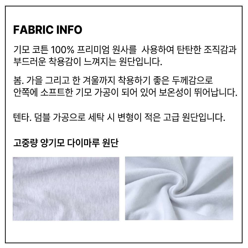 - 기모코튼 100%의 고급 원사를 사용하여 착용 시 부드러운 착용감을 느낄 수 있습니다.