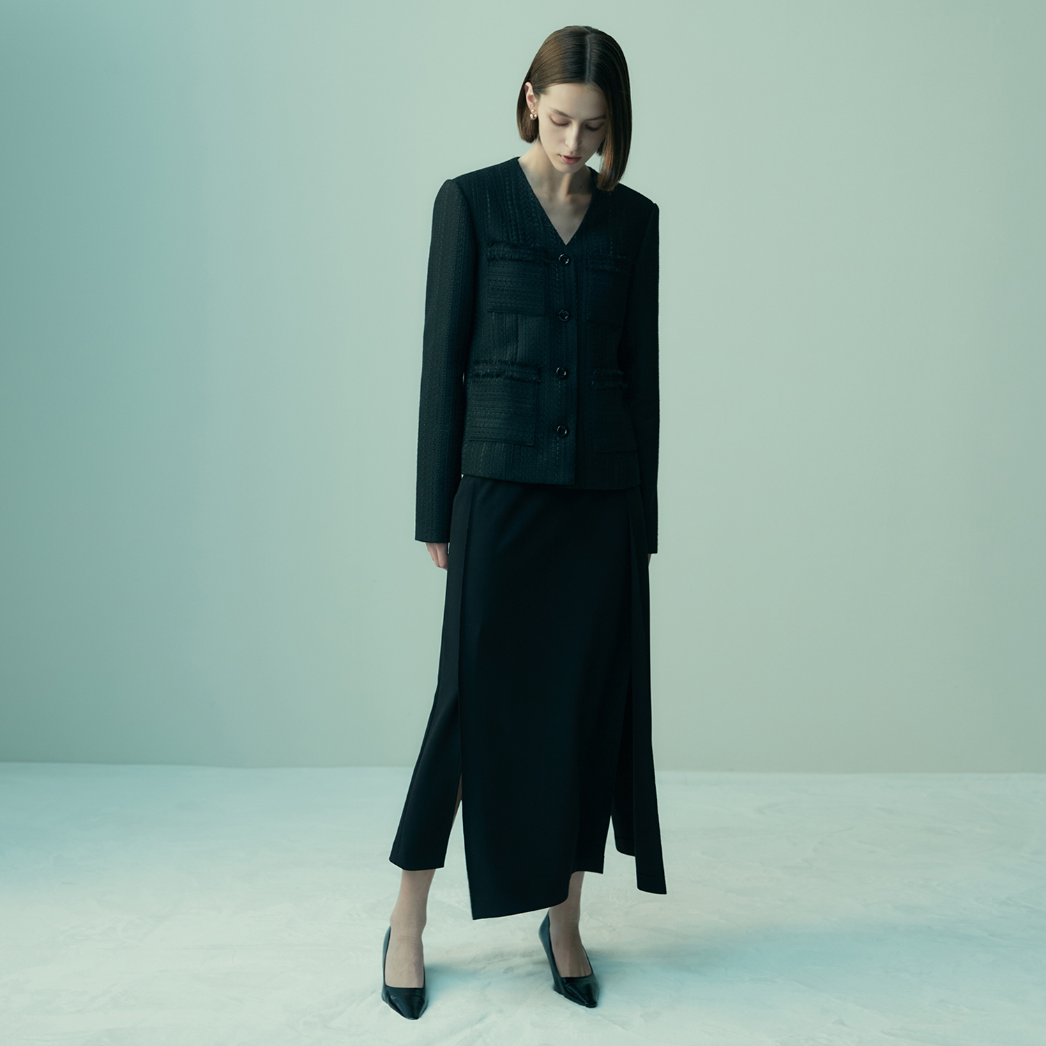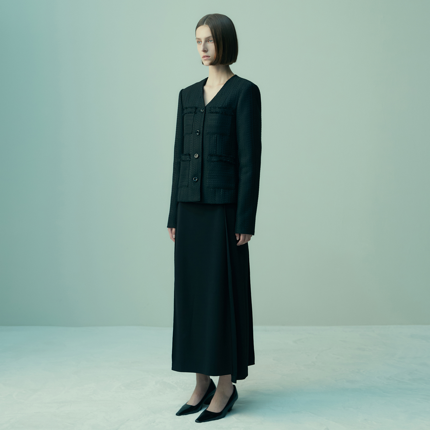 탄탄하고 섬세한 조직감과 짜임이 돋보이는 텍스처의 고급스러운 트위드 소재를 사용한 재킷입니다.
