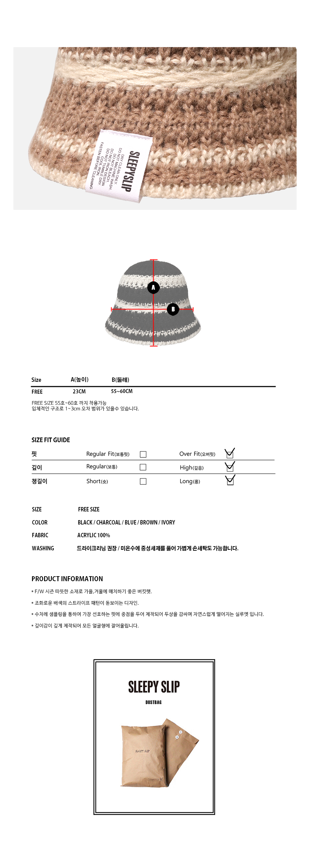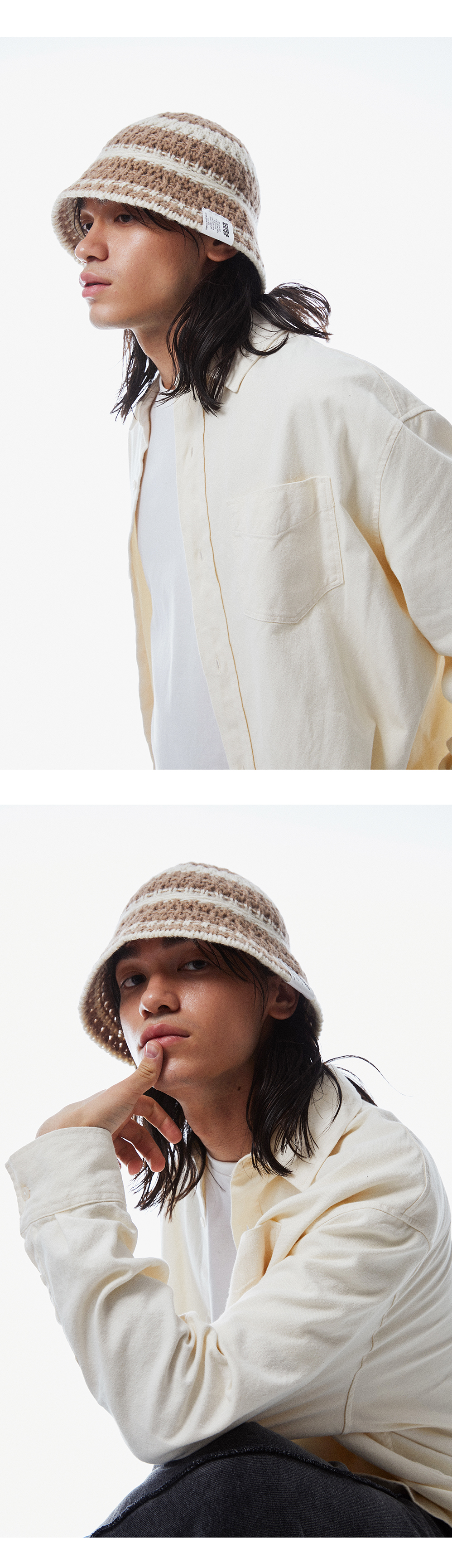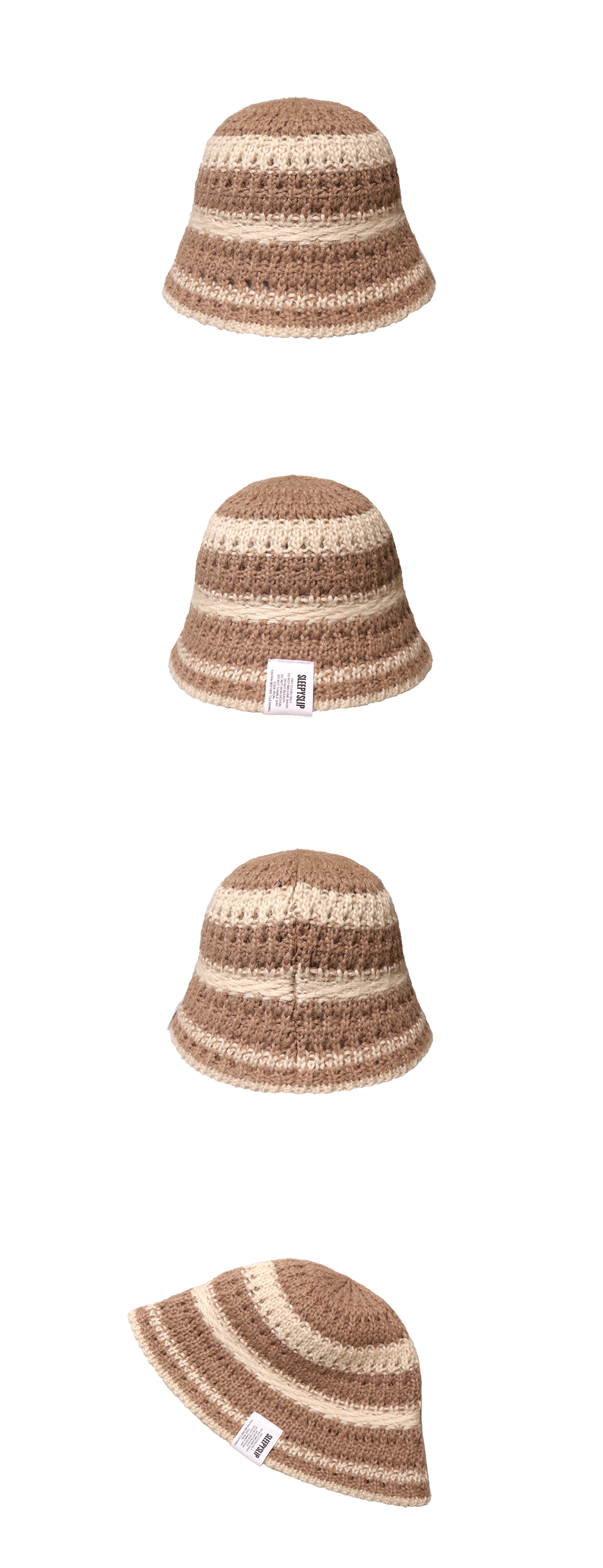 스트링 디테일로 안정감 있게 착용되는 니트 비치 버킷햇