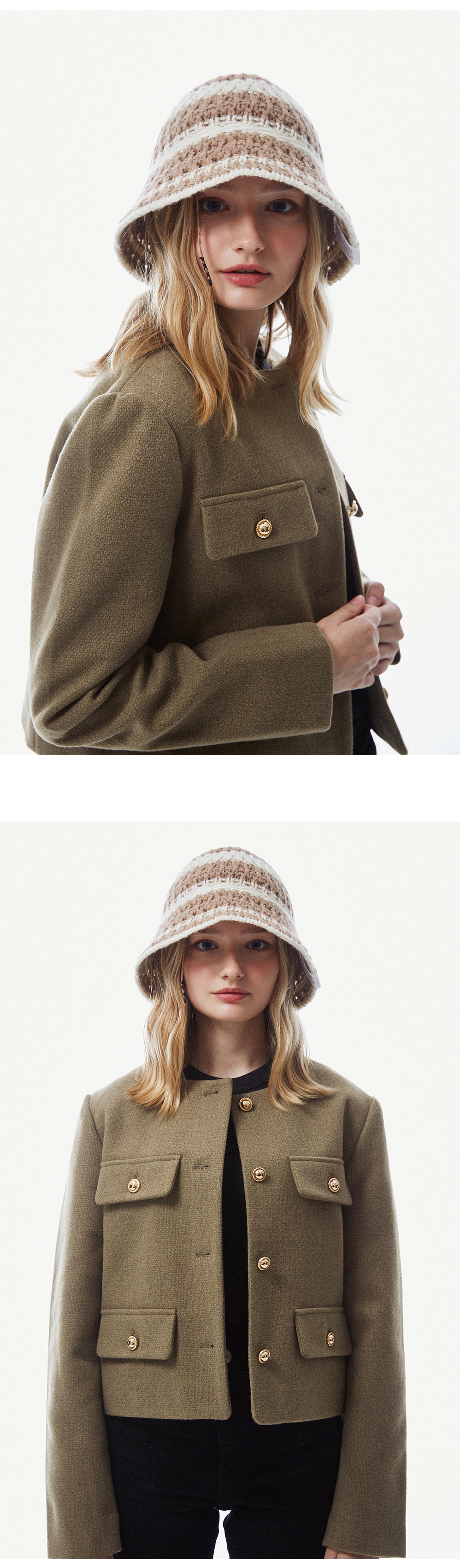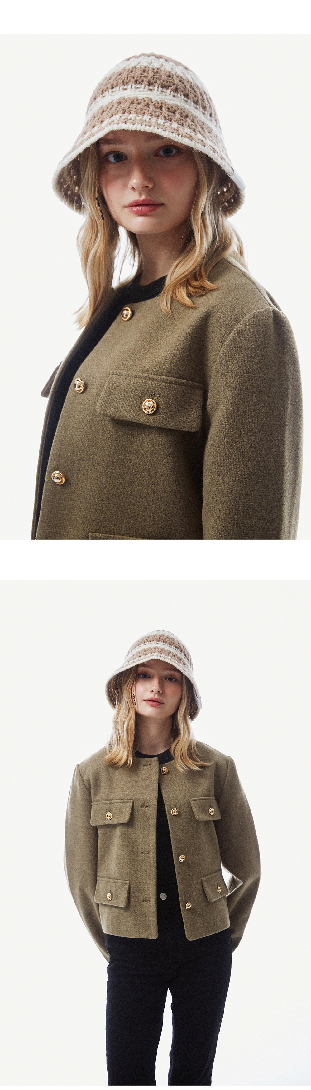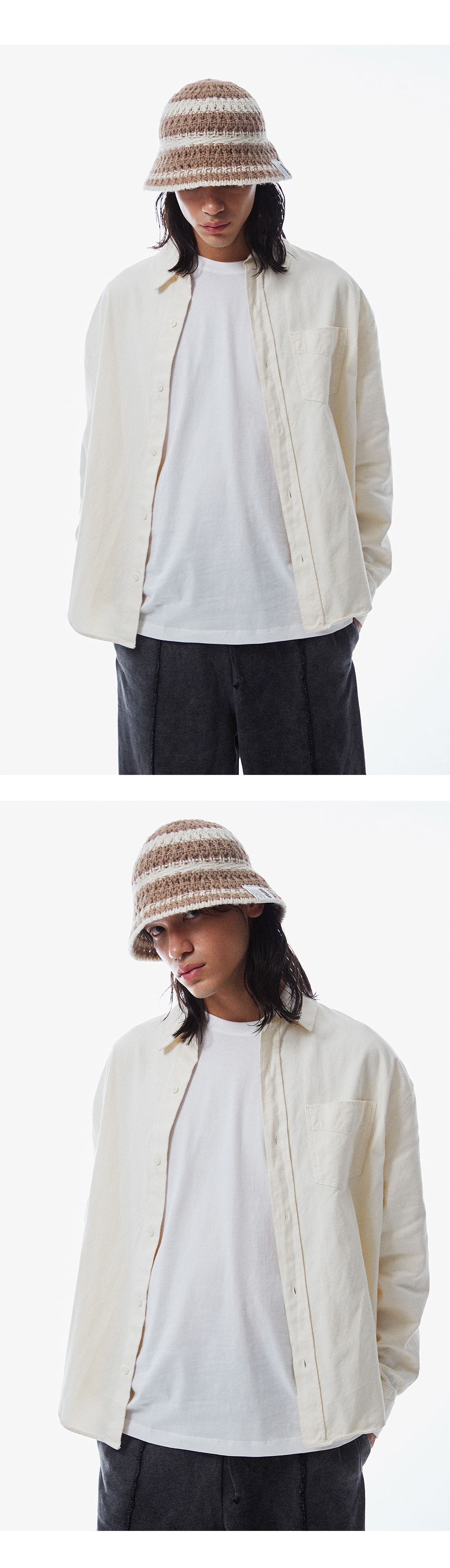 스트링 디테일로 안정감 있게 착용되는 니트 비치 버킷햇