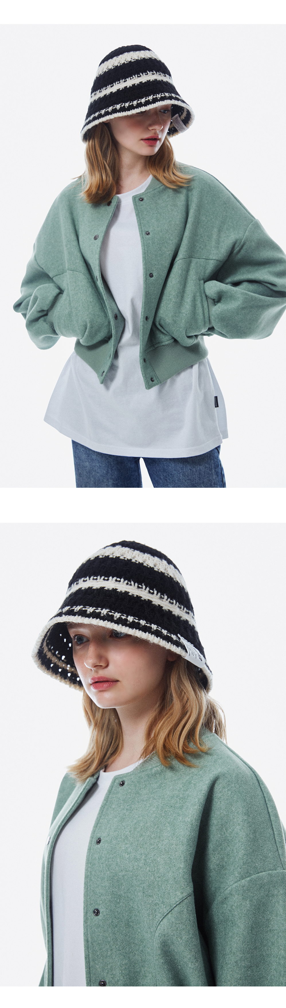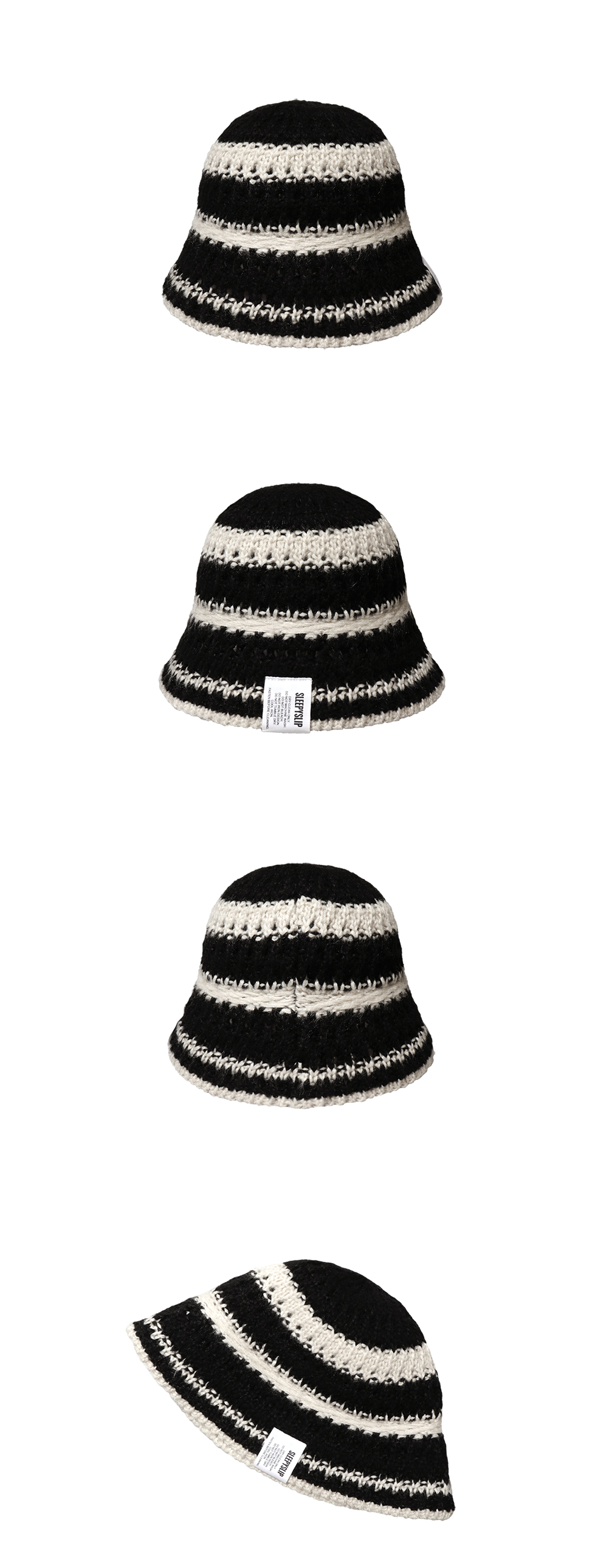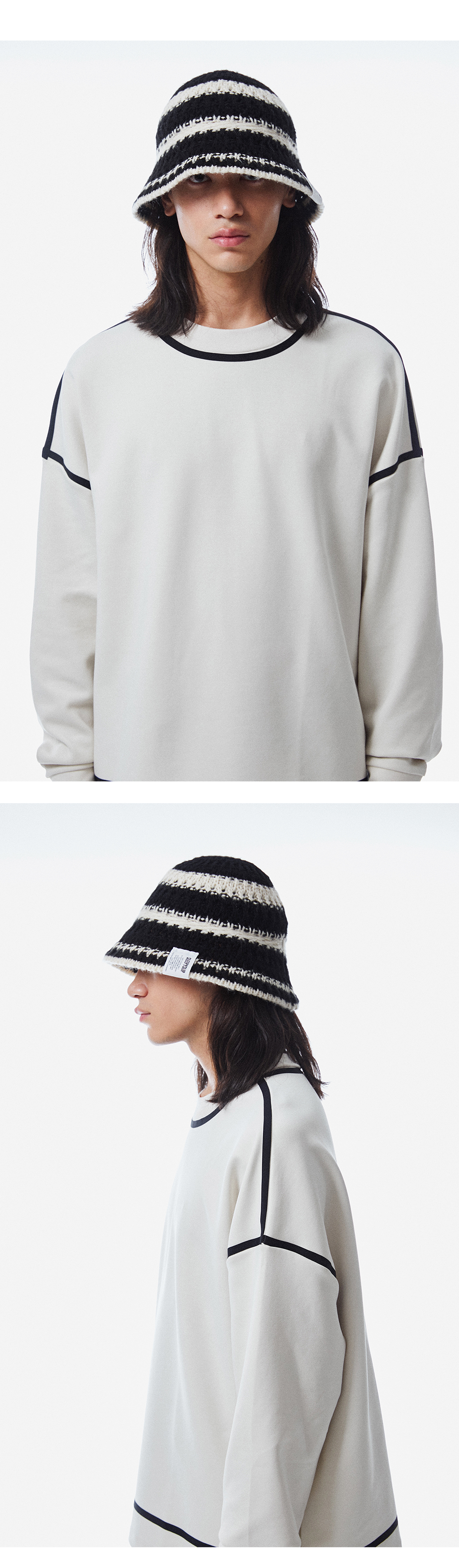 스트링 디테일로 안정감 있게 착용되는 니트 비치 버킷햇