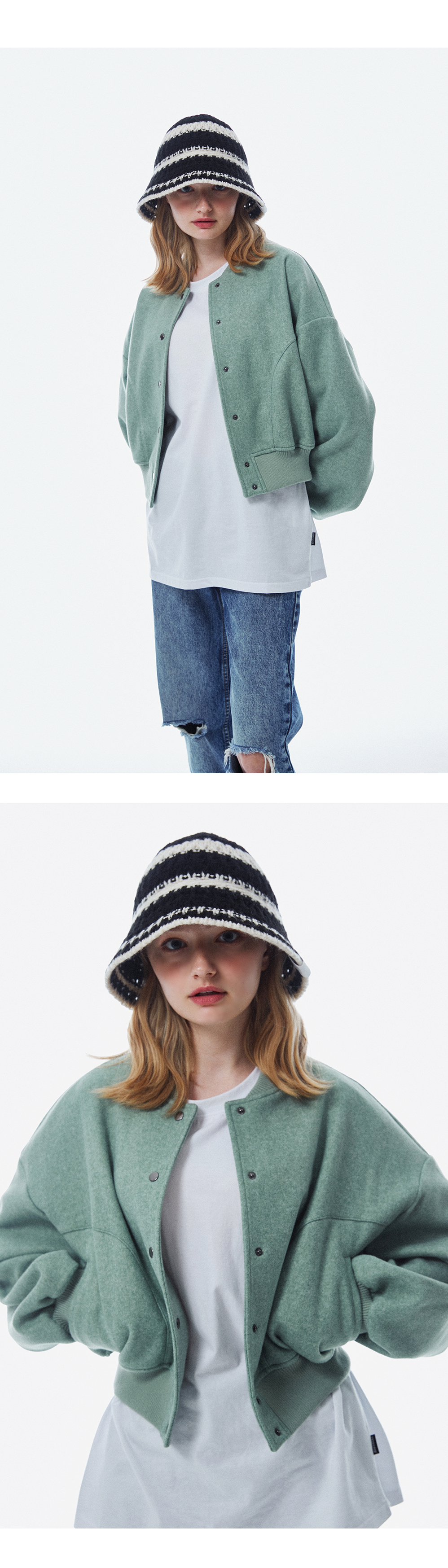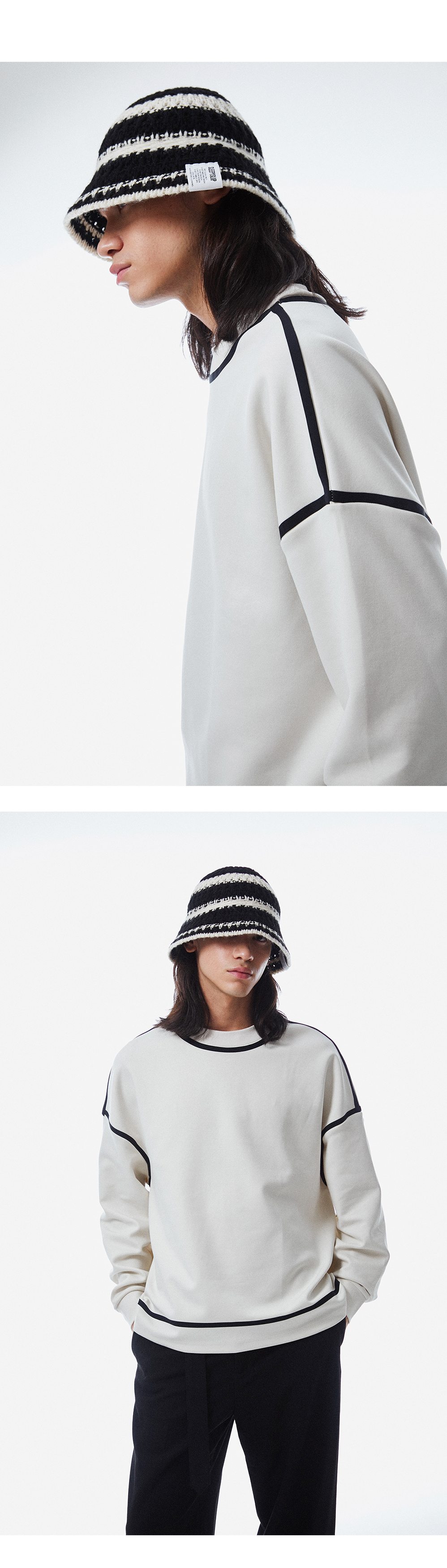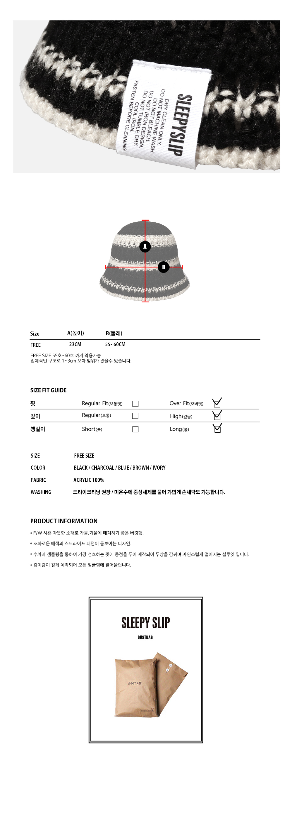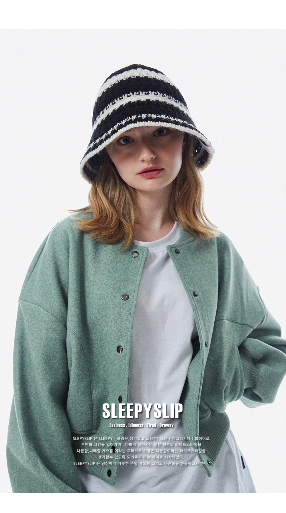 스트링 디테일로 안정감 있게 착용되는 니트 비치 버킷햇
