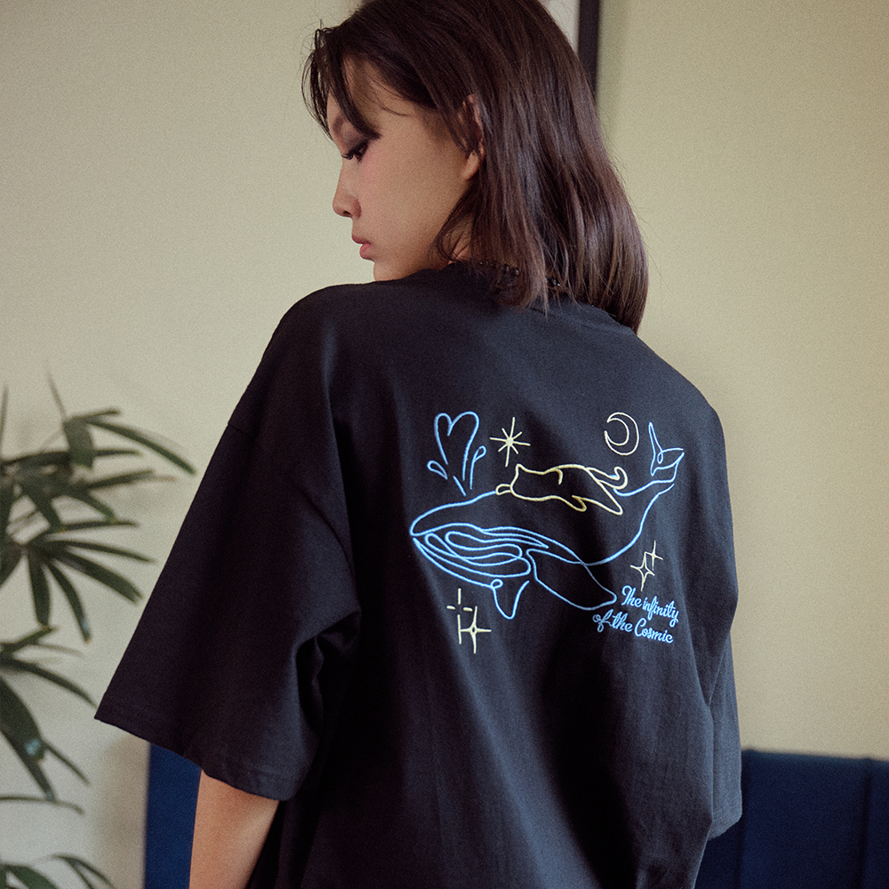 그래픽과 레터링을 전체 자수로 표현하여 작업된 디테일한 그래픽 디자인입니다.