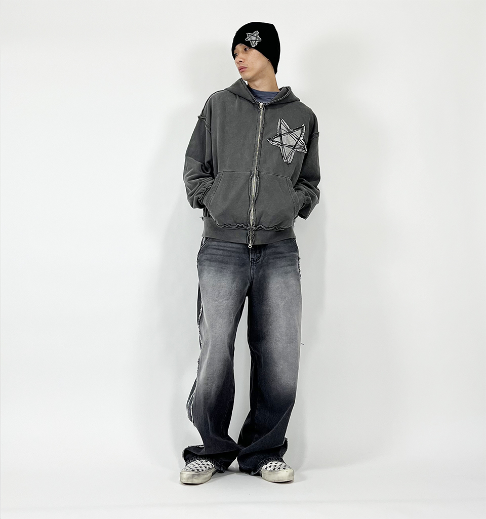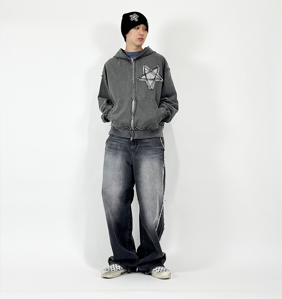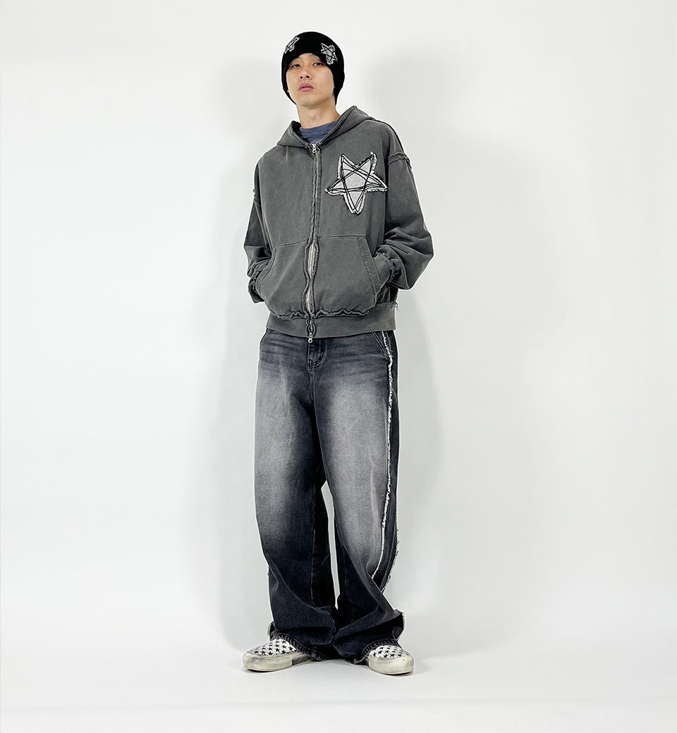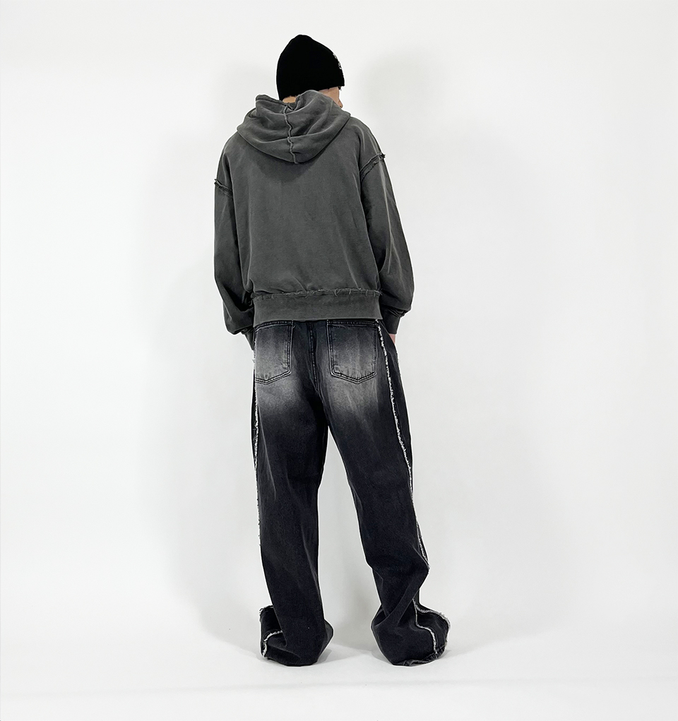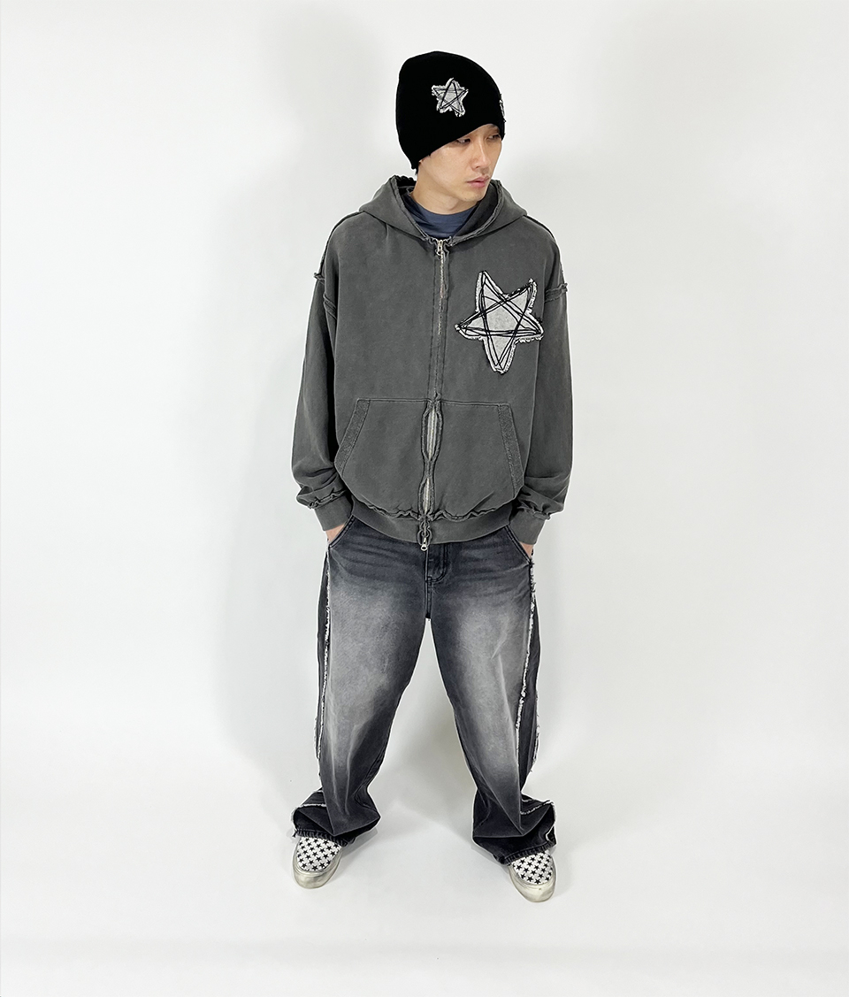 2-WAY Ear Stand Pigment Hoodie Zip-Up (Smoke Black)